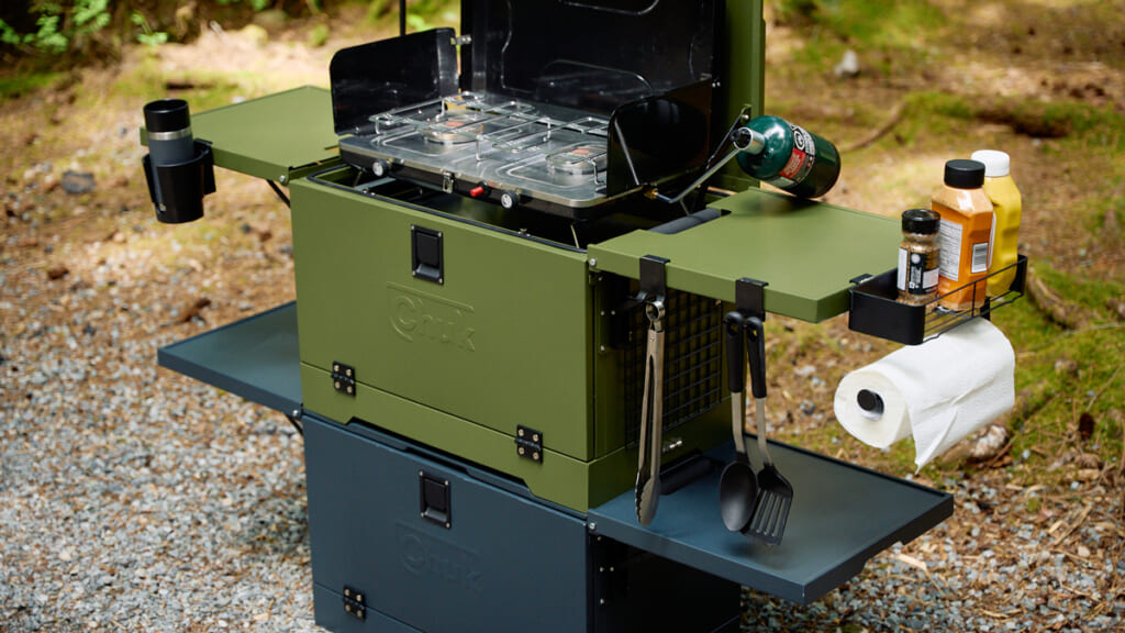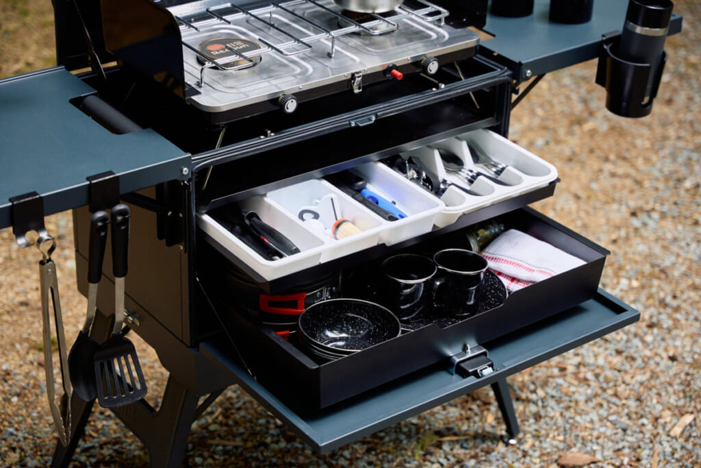 ごちゃつきがちなキッチンギアの収納と使用をこれ一台で完結することができ、まるで家さながらの調理環境をアウトドアに持ち出せるアイテムだ。