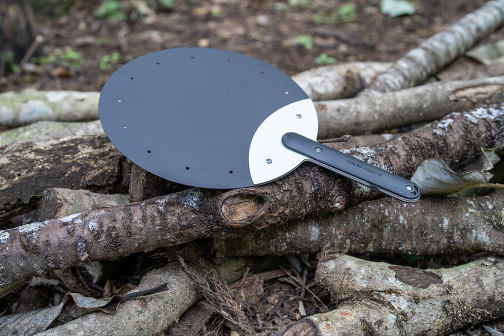 「フラメロ」は、金属製で火が燃え移る心配なく、焚き火の炎をコントロールすることが可能なうちわ。ブランドロゴがあしらわれたグリップ部分には、ストラップを取り付けられる穴も搭載。焚き火ラックにひっかけておけば、焚き火を愛でながらすぐに使うことができる。