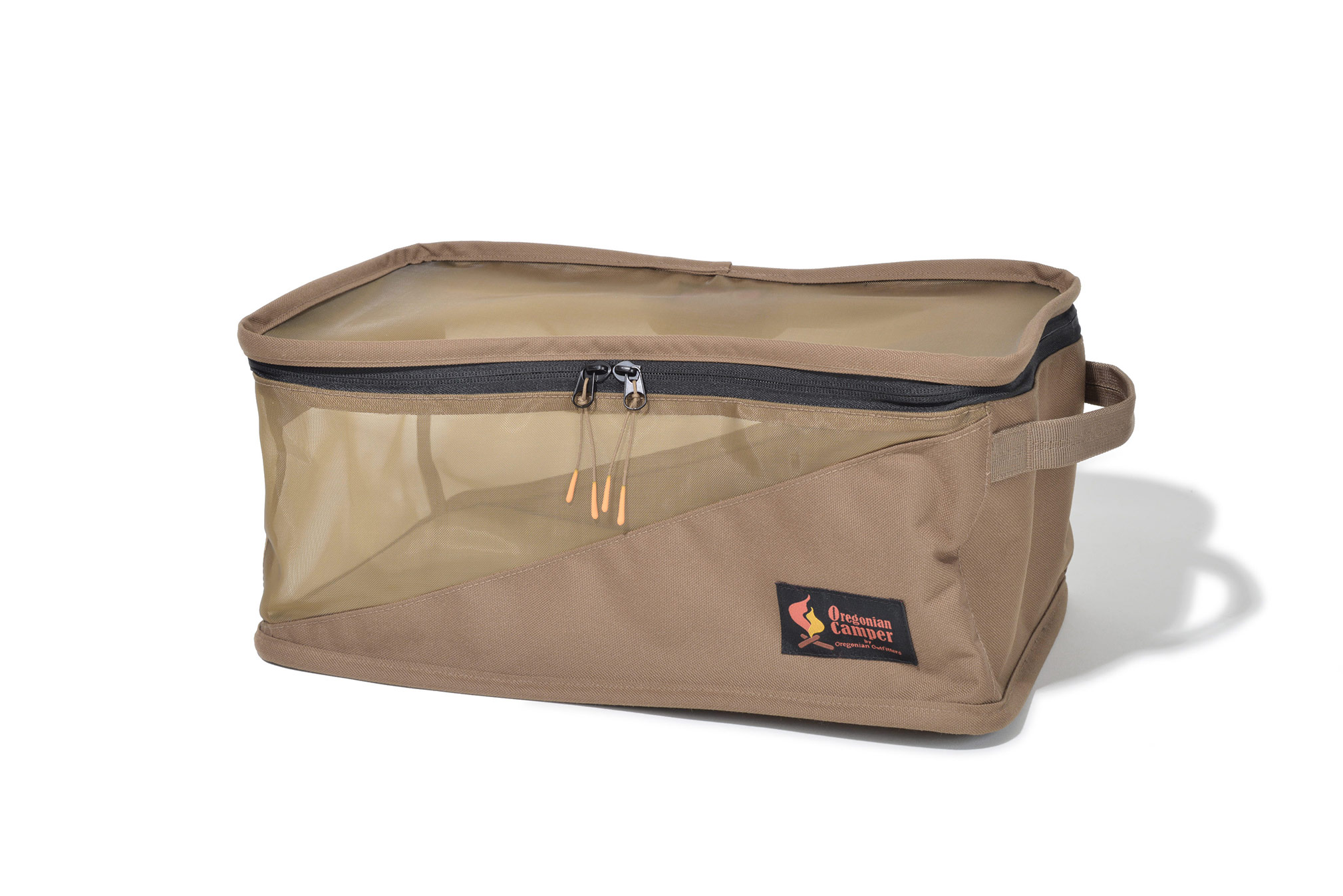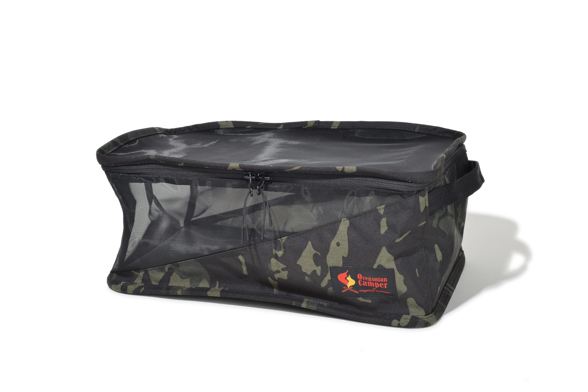 こちらも蓋だけでなく、側面上部がメッシュとなっているので何が入っているかが一目瞭然。また、タープたシェルターなどを収納しても、メッシュによって通気性が確保されているため、湿気を逃しやすいのも利点です。