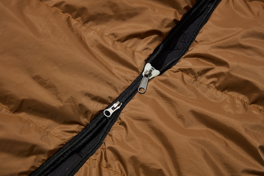 アイコニックな配色とともに二度見してしまうほどの存在感を放つジップ。通常のサイドジップだと閉めるのにもたつくという声を聞き、GO OUT別注によって寝袋に入った状態でスムーズに開閉できる前面の斜め仕様に。