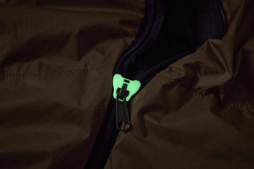 さらに、ダブル仕様となったジッパーのパーツは生地の噛み込みを軽減しつつ、上部を暗闇で使いやすいように蓄光タイプを採用。デザインのアクセントとして効果を発揮しつつ、ストレスのない使い心地を追求したコラボだけのディテールです。