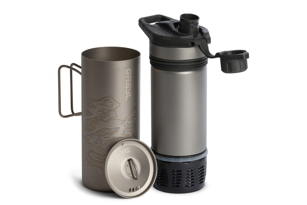 まずは浄水カートリッジとボトルが一体型になったプレス式浄水ボトルを開発する「GRAYL(グレイル)」。グレイルのプレス式浄水ボトルのなかでも710mLの原水を約8秒で浄水できる大容量・大流量モデル“ジオプレスピュリファイヤー”にチタンモデルが登場した。
