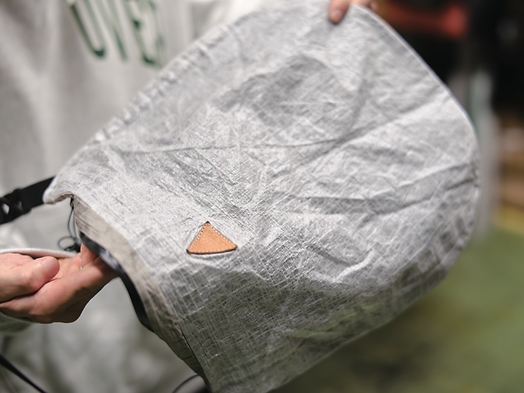 上出:まだ2年目なので全然ですけど、フリースTは改良して新しいの作っていたり、バムフラップが良い値段するから、もっとコストパフォーマンスに優れたものをナイロン生地で作っていたりもする。ちなみに今手元には、カメラバッグのサンプルなんかも。DCFでカメラバッグを作ろうとすると、どうしても設計がナウな感じになってしまう。それをもっと昔からあるような雰囲気にしたくて、実現したのがこれ。「ハイサンソウ」という悠平がやっているバッグのブランドに〝魔改造〞という古いものをまるごと作り替える取り組みがあって、このカメラバッグもそのプロジェクトとしてできた。バックパックも面白いのを考えている。