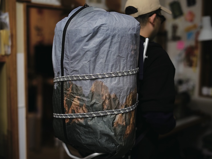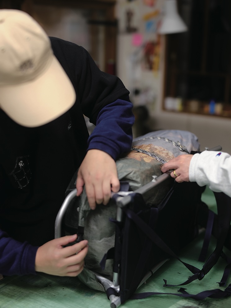 上出:僕はいろんな旅をしてきているから、特にカバンは本当に必要なものといらないものがきっちりとあるんです。このカバンならどこまでいけるだろうっていうのが透けてみえるくらい。日本の山はいけるけど、アメリカだとちょっと不安だなとか、どんな山もいけそうだけど、これでアフリカに行ったら狙われそうだなとか。だから、地球上の網羅率の一番高いバックパックを作りたいと思っている。拡張性、シンプルさ、リッチに見えない、修理が可能か、とかいろんな要素をクリアしたもの。その上でちょっと古臭いのがいいっていう好みも出ちゃうからややこしいんだけど。