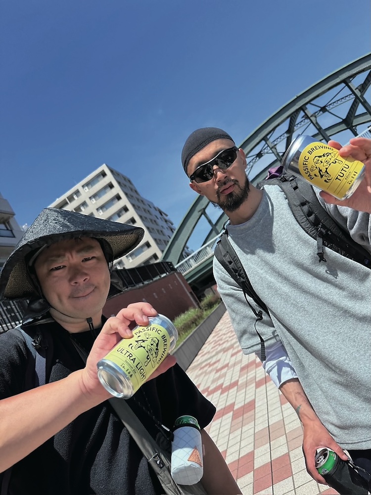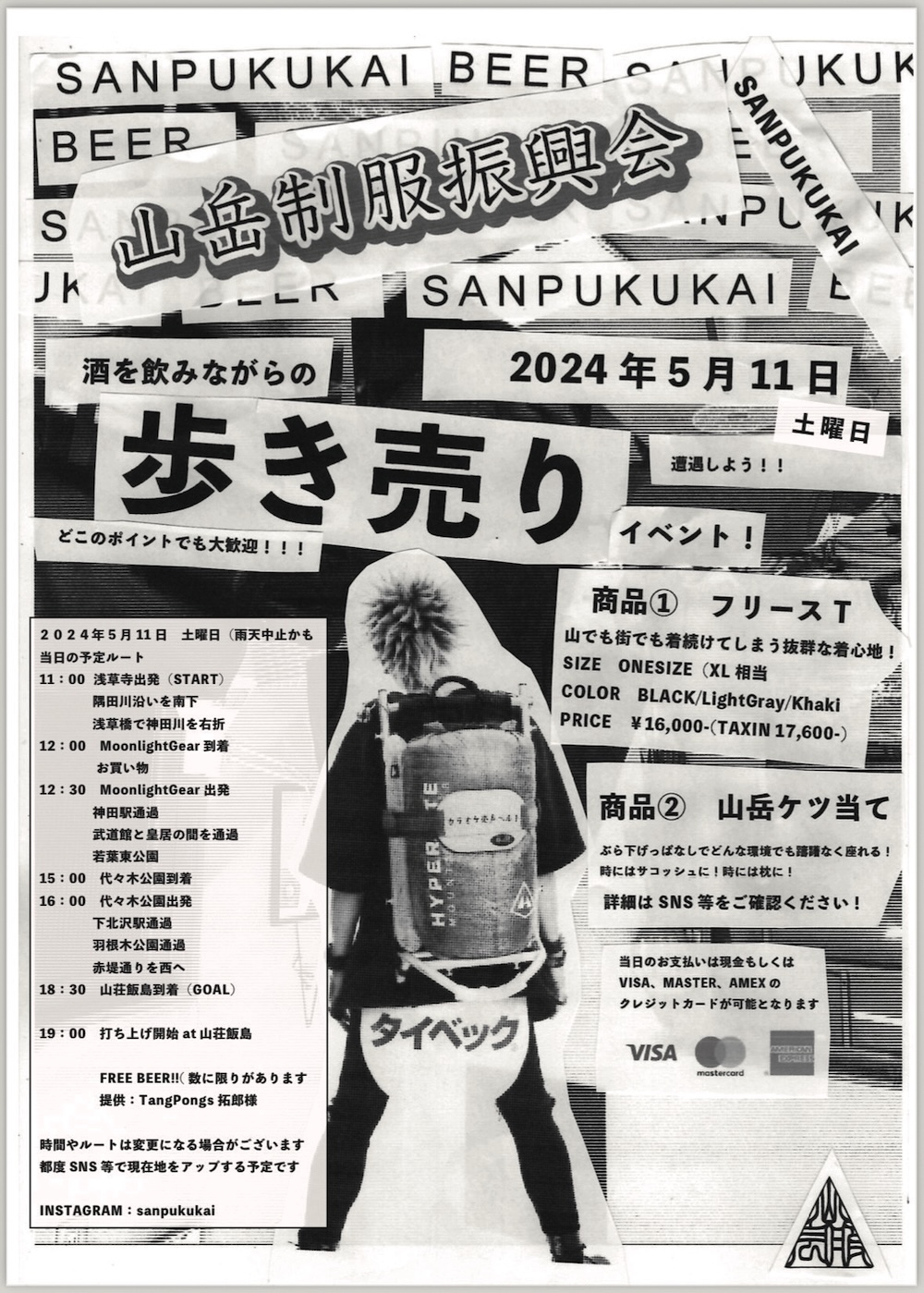 2つの商品(フリースTと、山岳ケツ当て)を引っ提げ、浅草寺を出発。岩本町・ムーンライトギアや代々木公園を経由し、ゴール地点となる世田谷・山荘 飯島までシティハイク。お酒でも飲みながら、なんて予定が思いのほか購入希望の客が集まり、なかなか前に進めず、結局タクシーを使わないと目的地まで辿り着けなかったほどだったとのこと……。
