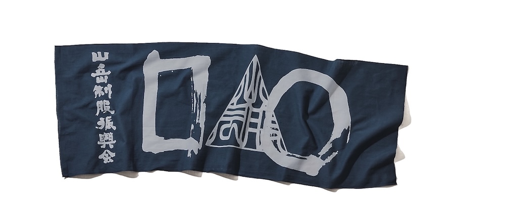 印鑑職人につくってもらったという三角のブランドロゴと、山岳制服振興会の文字がプリントされた手ぬぐい。こちらは染めによる風合いが絶妙な新色で、使うことで独特の色落ちも楽しめる。