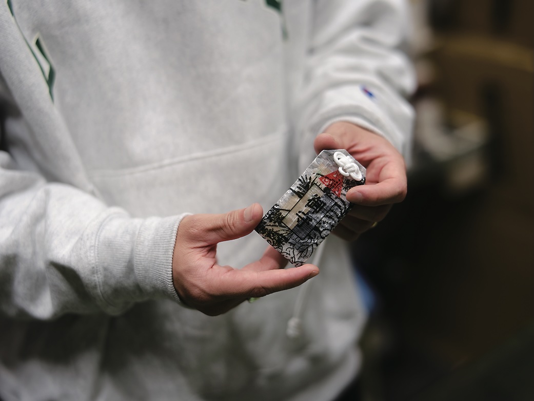 ダイニーマコンポジットファブリックの御守り。本来の御守りに施されている模様とブランドロゴをプリントしているだけではなく、中にはリペア(裁縫)道具が入っていて実用性もある。