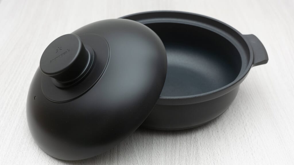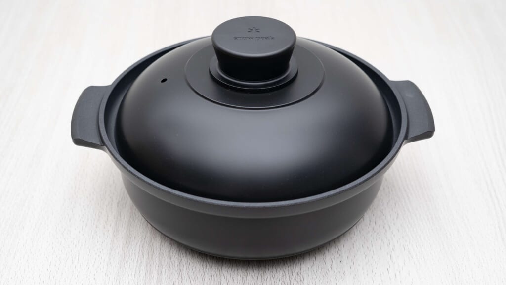 アルミニウム合金製なので軽量で扱いやすいうえ、熱まわりがよく、食材にじんわり熱が入っていく感覚が味わえます。見た目は土鍋のようでありながら、アウトドアのタフな環境にも耐える仕上がりになっています。外装と蓋裏にはブラックのセラミックコートを施し、内側にはフッ素加工を採用。焦げつきにくく、後片付けが簡単です。