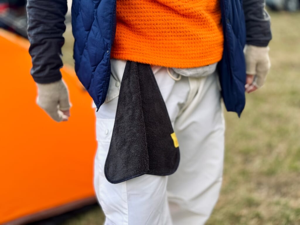 「このタオルは、吸水性と伸縮性がめちゃめちゃ高くて、肌触りもいいんです。登山のときはループにカラビナを付けて、バックパックや腰にぶら下げてます。ぶら下げたときのシルエットも野暮ったくなくていいデザインですね。」