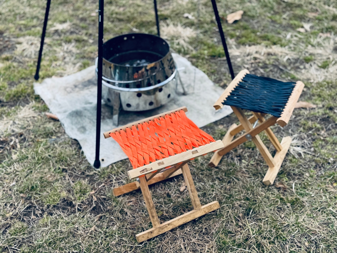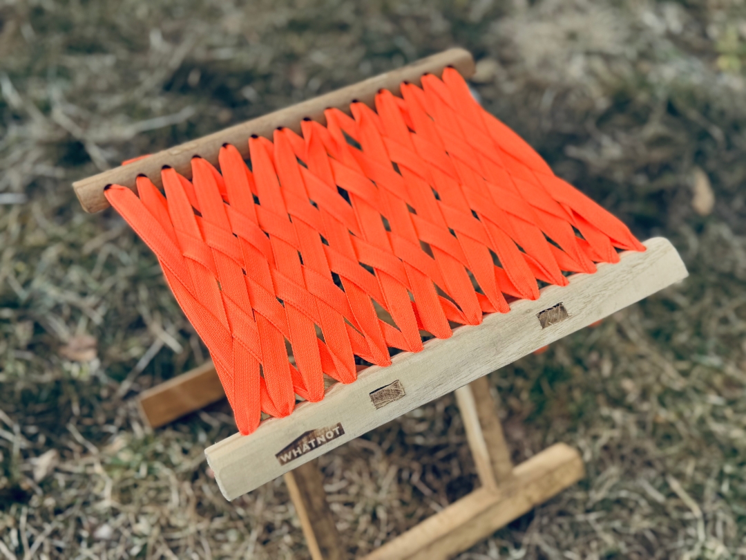 無骨な焚き火ギアが並ぶサイトの中で、ひときわ目を引いていたのが、このオレンジカラーのチェアでした。こちらは、ウッド製のX型フレームと、平紐の編み込みによるシートが特徴的なランバージャックスチェアのワットノット別注モデル。