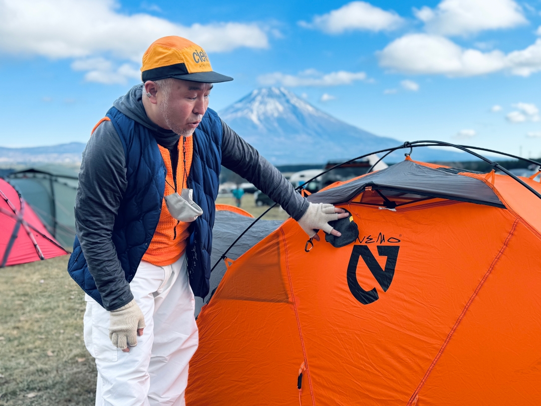 続いてのアイテムは、こちらのオーナーさんがテントの朝露を拭くのに使用していた三角形のタオル。こちらは、アウトドアに最適なブランケットなどが人気のブランド、LUGH(ルー)のタオルシリーズ「アウトドライヤー」のものでした。
