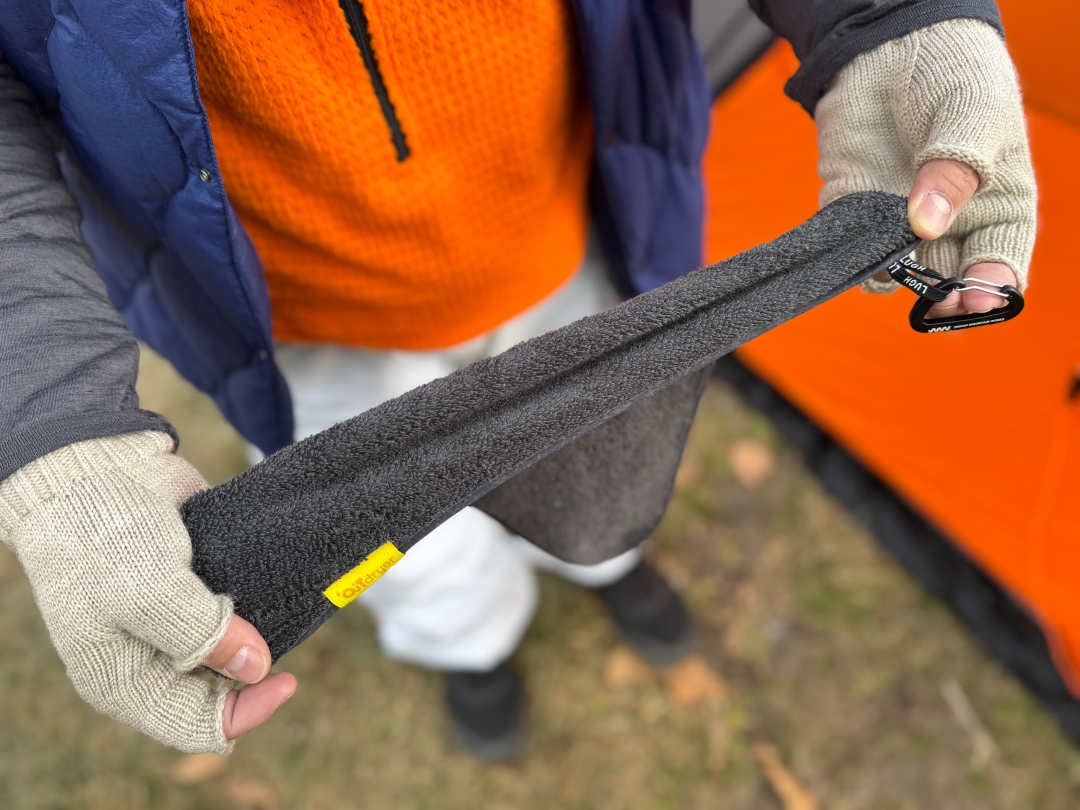 「このタオルは、吸水性と伸縮性がめちゃめちゃ高くて、肌触りもいいんです。登山のときはループにカラビナを付けて、バックパックや腰にぶら下げてます。ぶら下げたときのシルエットも野暮ったくなくていいデザインですね。」