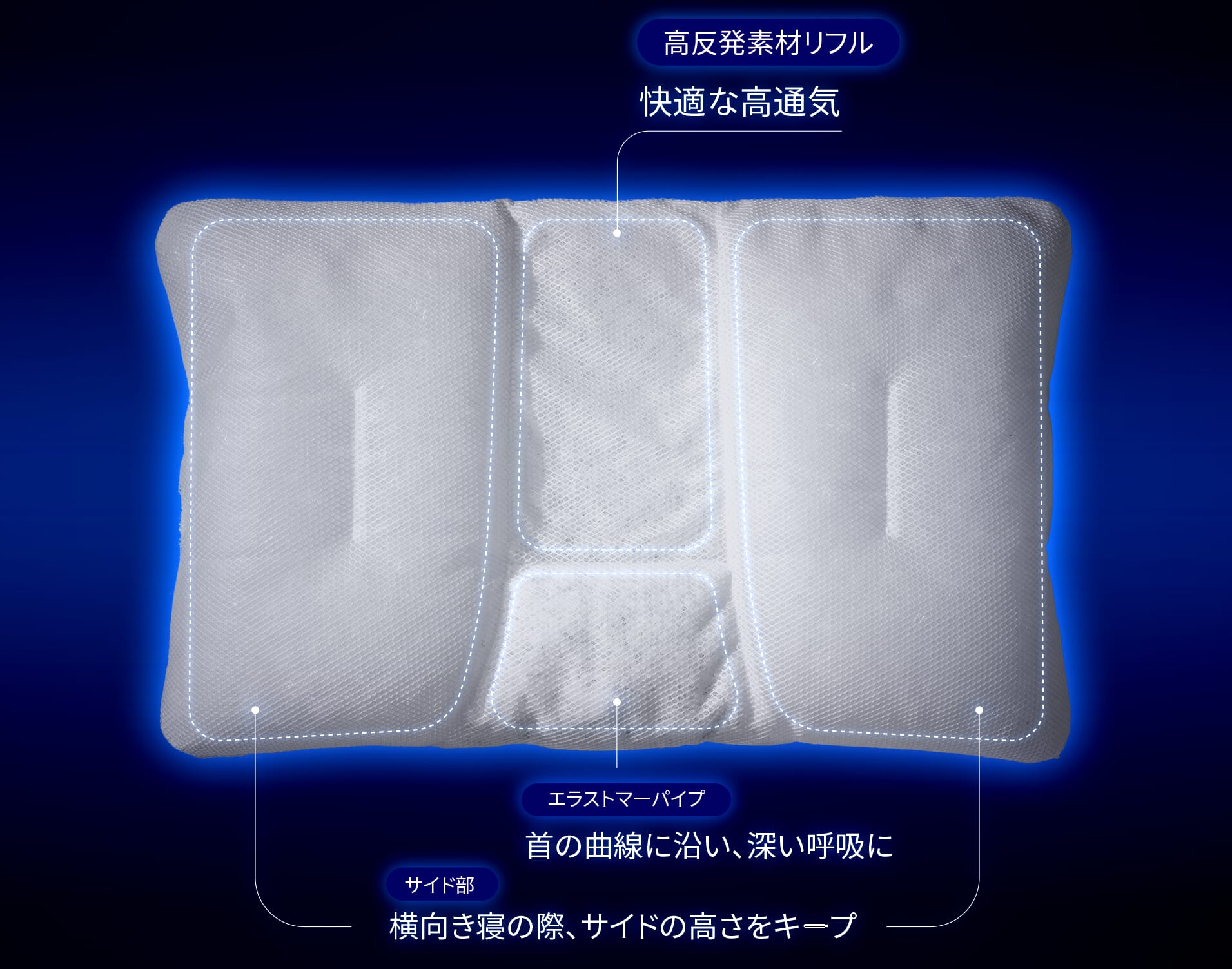 頭部には、通気性と耐久性に優れた高反発網状素材「リフル」を採用。へたりにくく、長時間使用しても蒸れにくいため、快適な睡眠環境を保ちます。