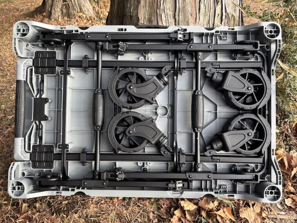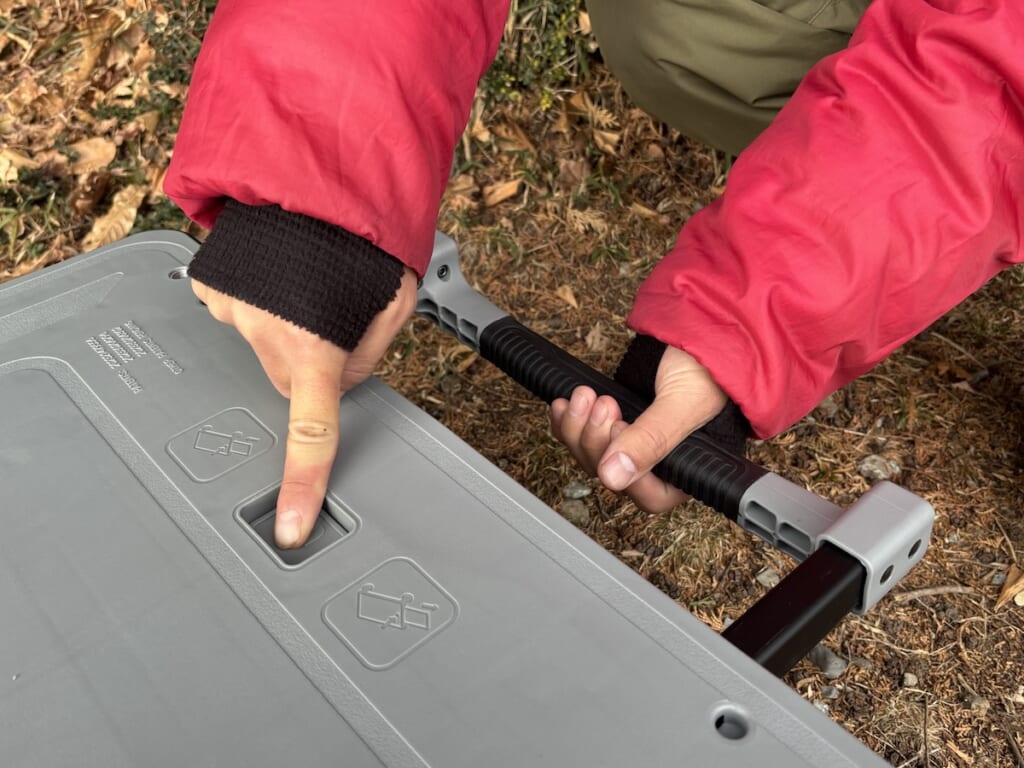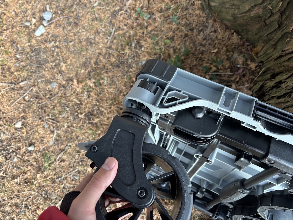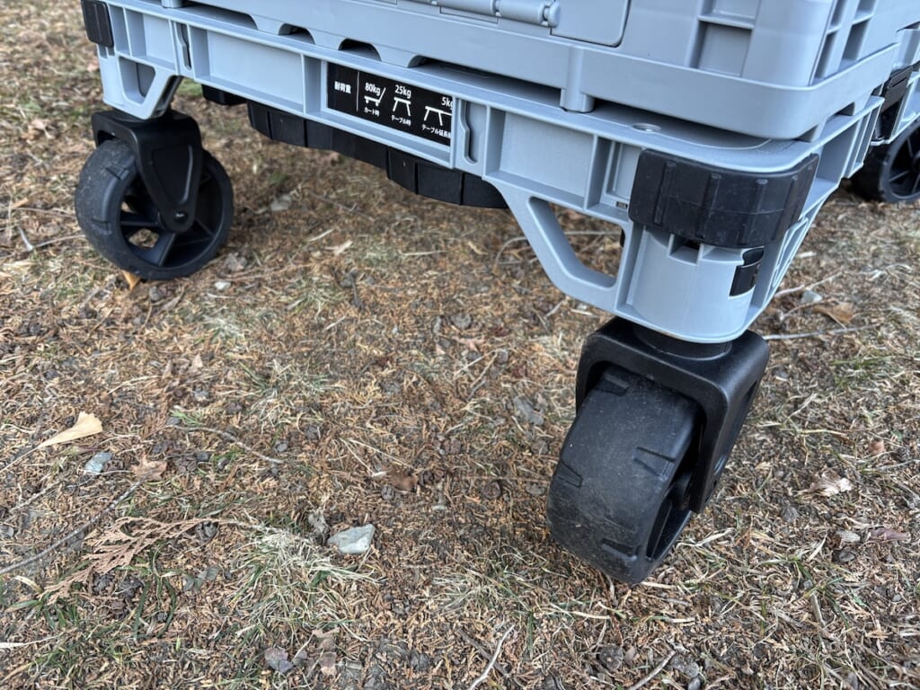 台車として使う時は、収納状態で裏側にはめ込まれていたタイヤを取り外し、角の穴に差し込みます。差し込み口にはストッパーも付いており、運搬中にタイヤがいきなり外れる心配はなさそうです。