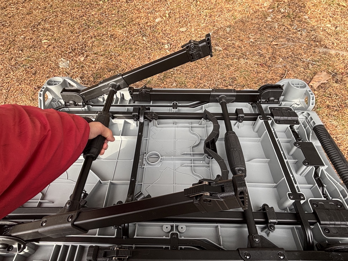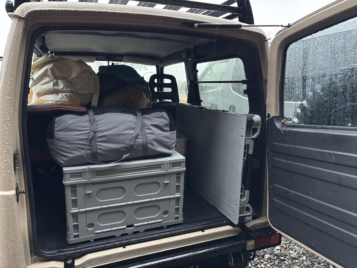 ちなみに天板サイズが858×573mmと収納状態でもそこそこの大きさはありますが、後部座席を畳んだジムニー(JA11)で、横にした状態で差しこみ、ちゃんとドアを閉めることができました。