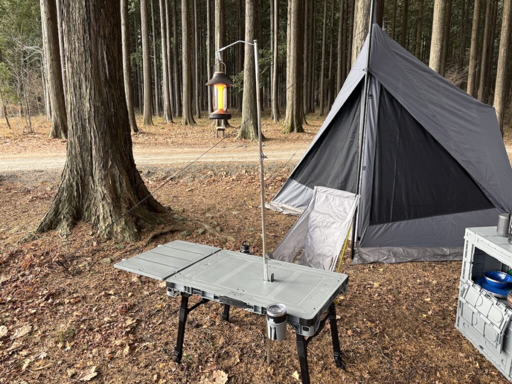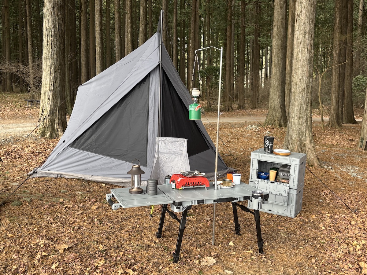 フラットカートダイニングを実際にキャンプサイトに組み込んでみると、ランタンポールを除き、台車で一度に運べる量のギアで、充実のソロキャンプサイトを作ることできました。