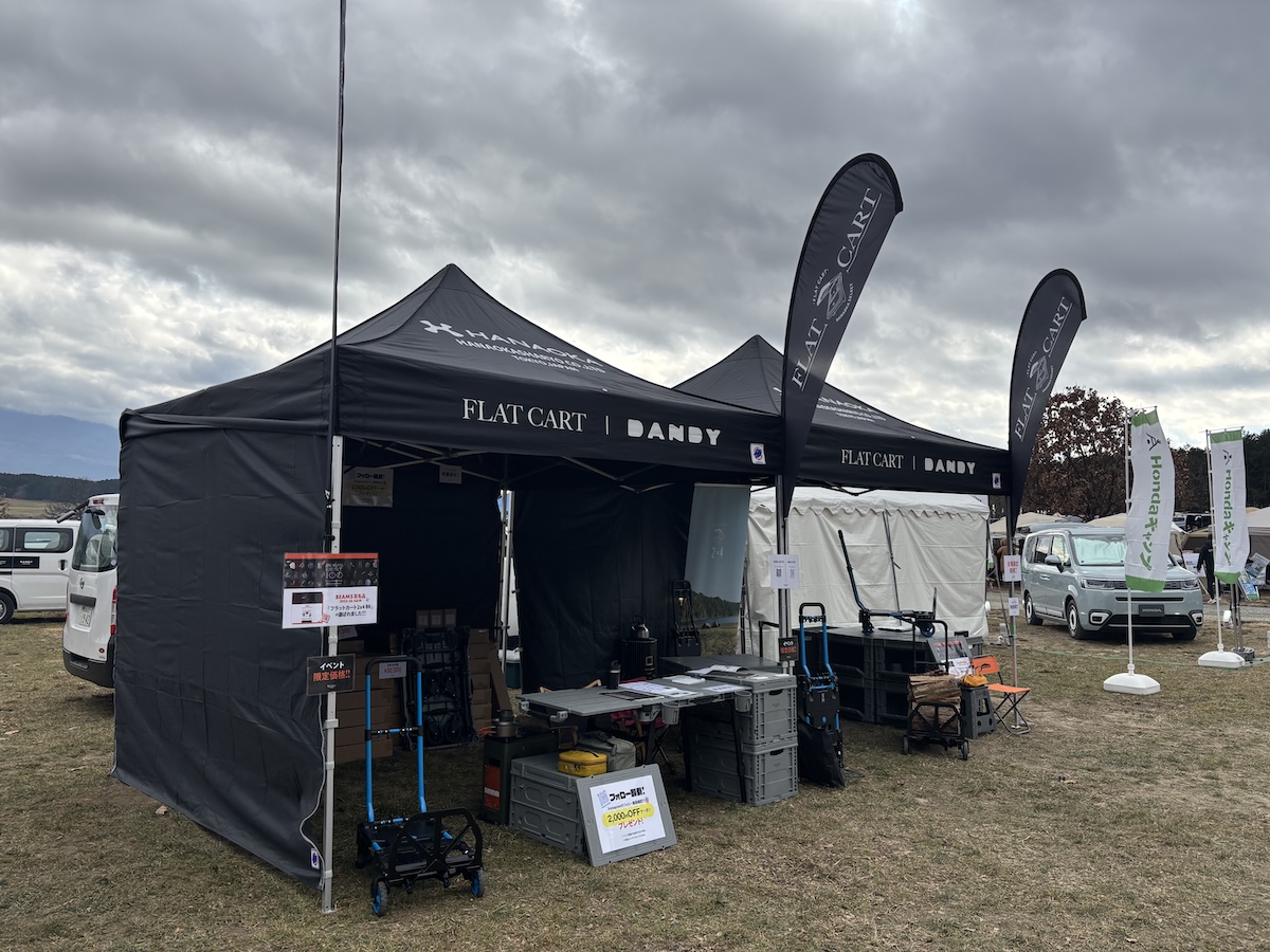 今回が初の出展だという、日本発の台車メーカー「花岡車輌」のブース。アウトドアでも使える台車「フラットカートシリーズ」を展示・販売していました。