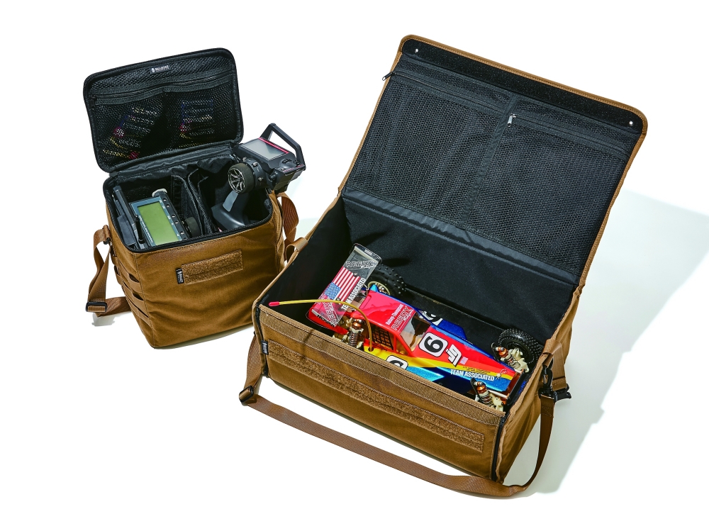 1/10のオフロードラジコンにちょうどいい大きさで、スタッキングしても前側から取り出せる機能的なバッグ。コントローラーボックスはプロポが2つ収納可能。「キャンプ道具といっしょにラジコンをクルマに積み込むのに便利です」。