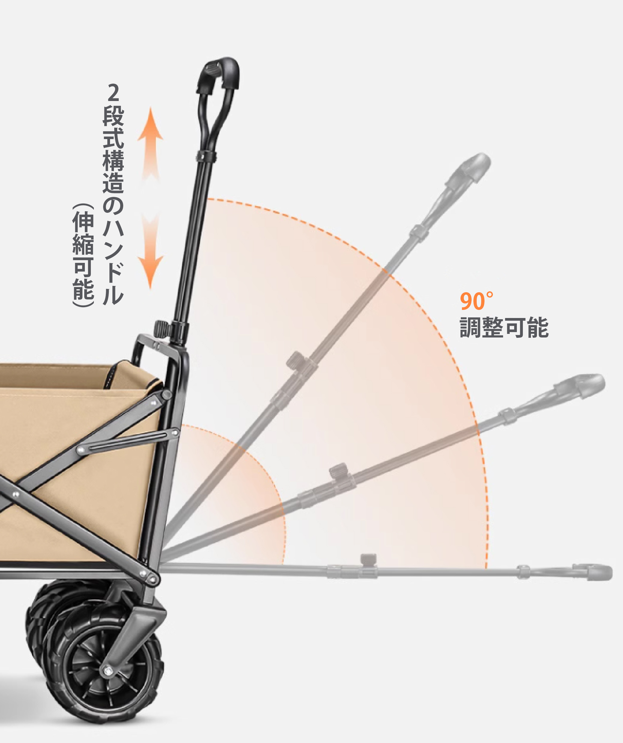 四輪タイヤは約120×30mの大径に仕上げて機動力を向上! 全て360度回転するので小回りも効かせやすい。さらに、ハンドルは90度でフレキシブルに稼働し、650~890mmで2段階の伸縮式だから体格や状況に応じて調整できるようになっている。