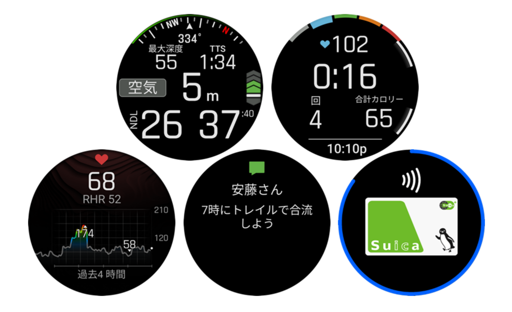 また、製品名にも付けられている AMOLED(有機 EL)の1.4インチカラーディスプレイを採用し、水中や雪原など様々なシーンにおいて高い視認性を持たせているのも特徴だ。水深 100mに耐えうる防水性や水中での操作を可能にする「インダクティブボタン」なども備えている。