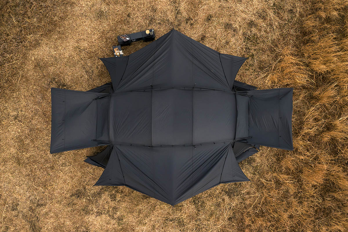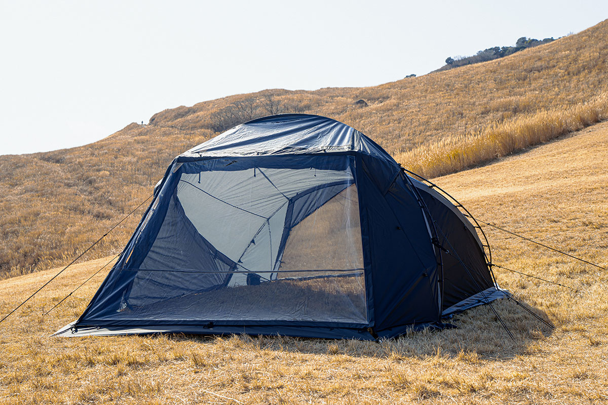「トウキョウクラフト」の“ウィングフォート”は、設営自由度の高さと、トンネル型ドームテントならではの優れた居住性を融合した2ルームシェルター。