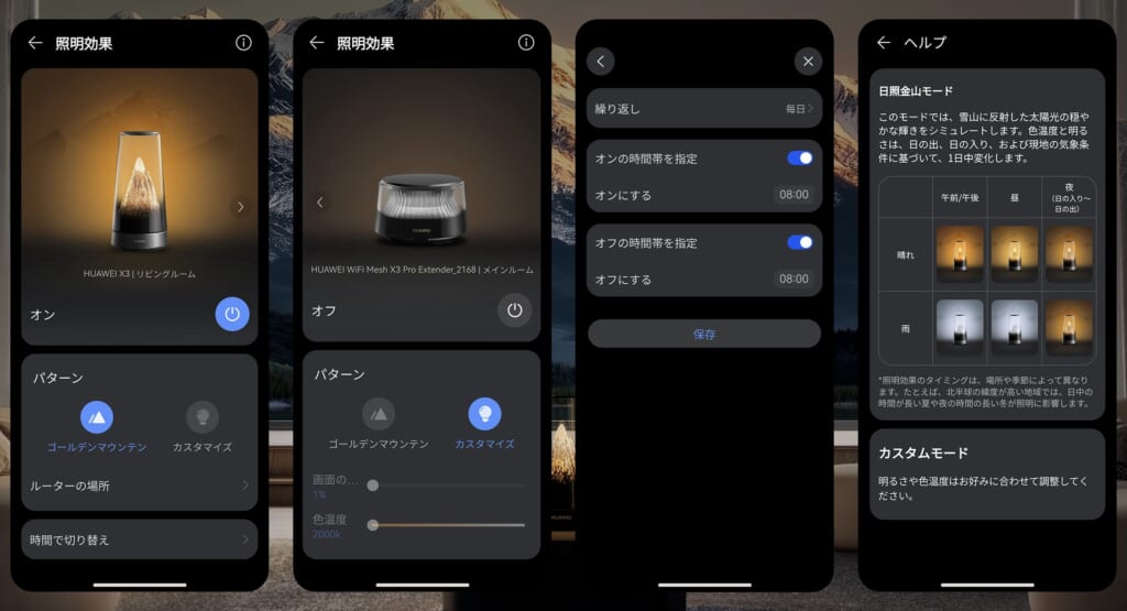専用アプリ「HUAWEI AI Life」から点灯時間を設定すれば、帰宅時にやさしい光が迎えてくれます。また、タッチするだけでライトのオン・オフもできるので、リビングや書斎、寝室など場所を選ばず空間をさりげなくワンランクアップしてくれます。