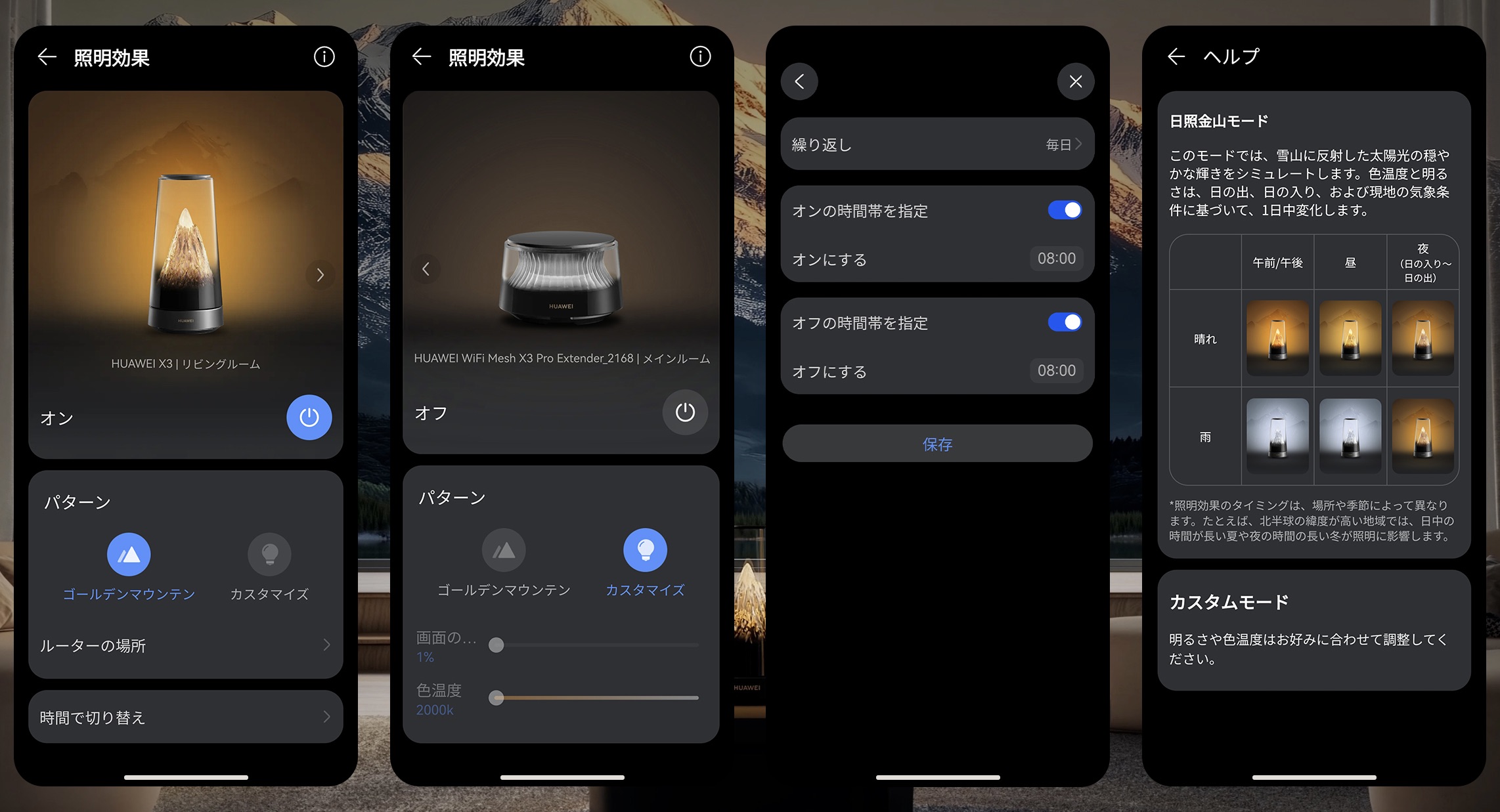 専用アプリ「HUAWEI AI Life」から点灯時間を設定すれば、帰宅時にやさしい光が迎えてくれます。また、タッチするだけでライトのオン・オフもできるので、リビングや書斎、寝室など場所を選ばず空間をさりげなくワンランクアップしてくれます。