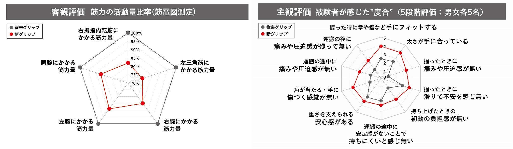 その結果、新グリップの方が従来と比較して筋力活動量を10%削減に成功! 被験者によると「手の痛みが減った」、「フィット感が増して滑りにくい」というコメントが多くみられた。
