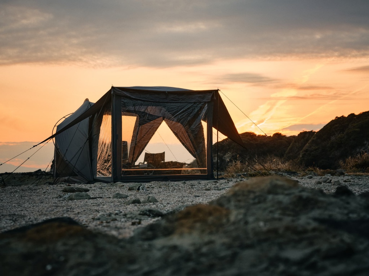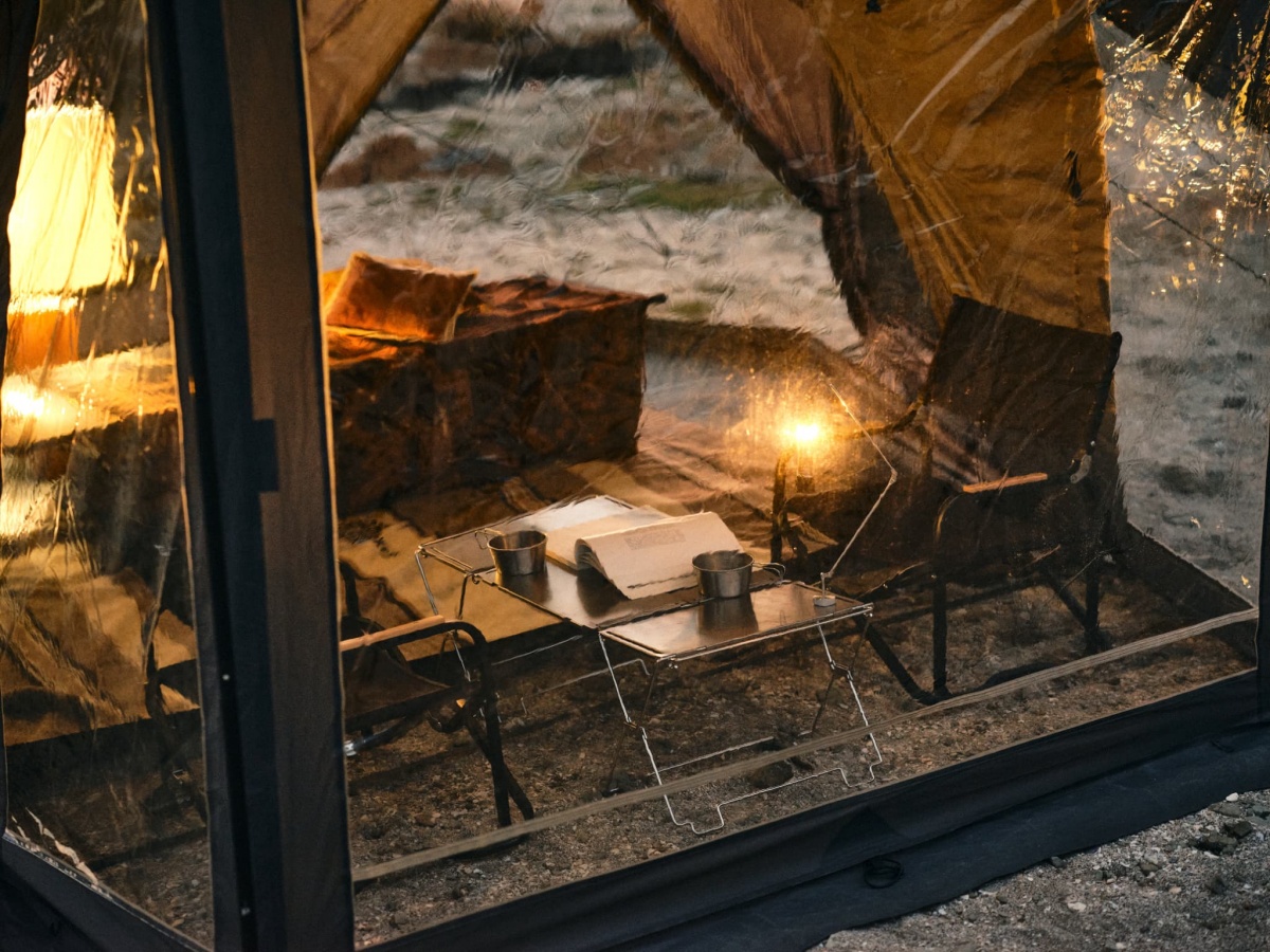 贅沢にソロ、デュオで快適に使える広さを確保したドーム型シェルターのオグニスドーム。“焚き火を楽しむ”がテーマの設計だけあって、跳ね上げパネルには耐火性の高いTC素材を採用。見落としがちだがサイドフラップが付いているのが結構革新的で、入口への雨の侵入を防いでくれる仕様だ。