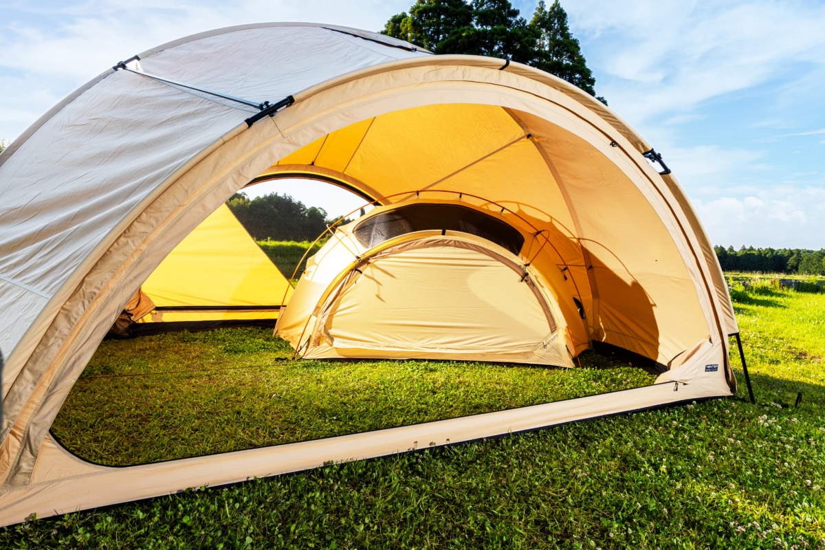 また独自のフレーム構造にも注目したい。3本のフレームが弓のようにしなる弾力性を持っているため、ペグダウンなしでも美しく張ることが可能。それによって広い室内空間を担保している。前後の大きなエントランスはオルタスさながら、フルメッシュにもできるので、外の景色を存分に楽しむことができる。