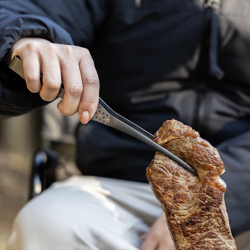 タフな使用に耐えるステンレス製トングは、巨大ステーキも扱えるほどにホールド力が抜群。麻の葉模様がアクセントで、上下どちらに置いても先端が付着しないので衛生的。