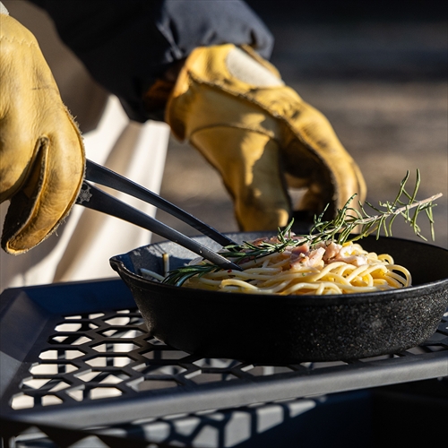 荒々しい雰囲気のデニム生地と、ステンシルアーティストのアートワークが調和。ギアが小分けできるポケットも相まって、キャンプ飯の調理が楽しくなる無骨なデザインです。
