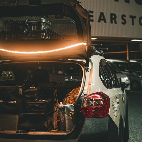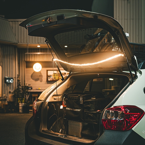 摩擦に強いウェビングテープタイプのLEDライトで、バックドアに取り付けられるのでオートキャンプを楽しむ外遊び好きの強い味方に。光量が10段階で調整できるのも魅力。