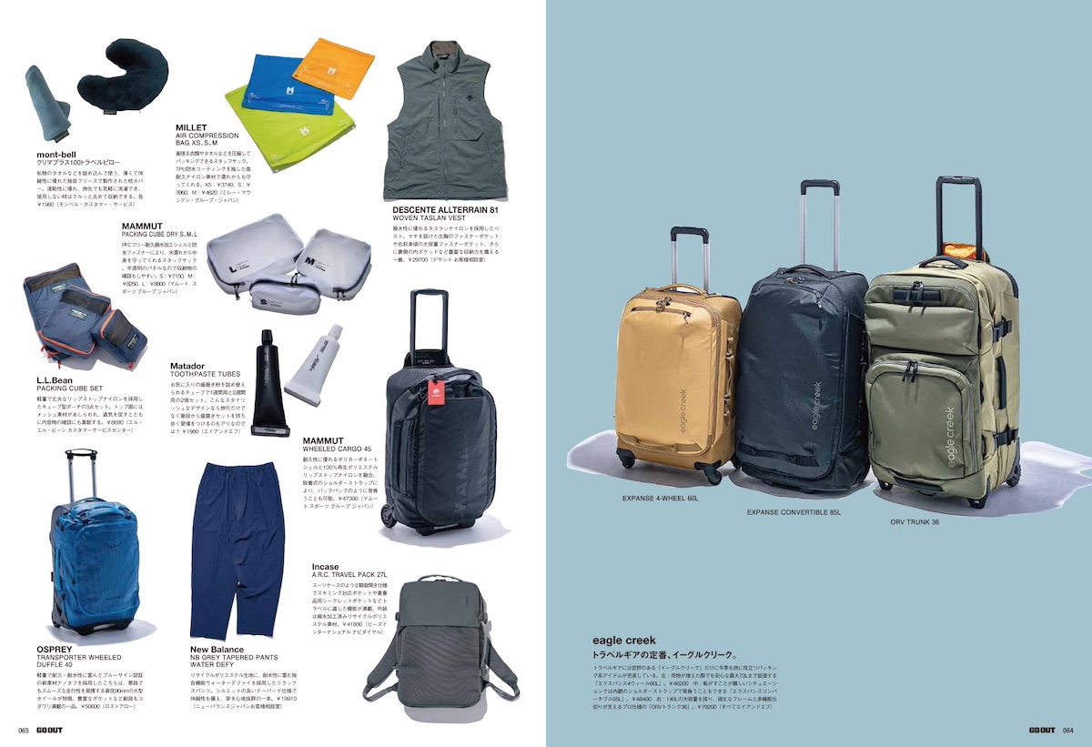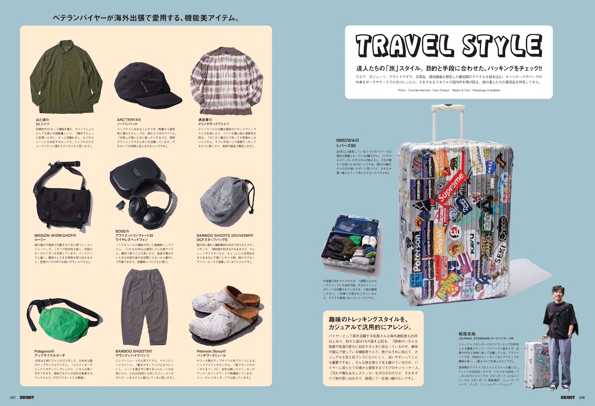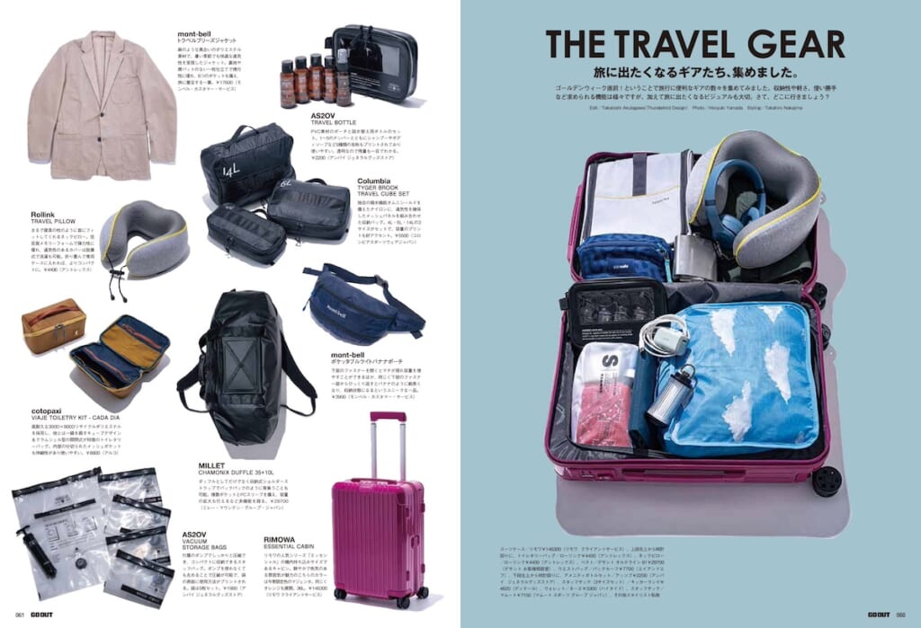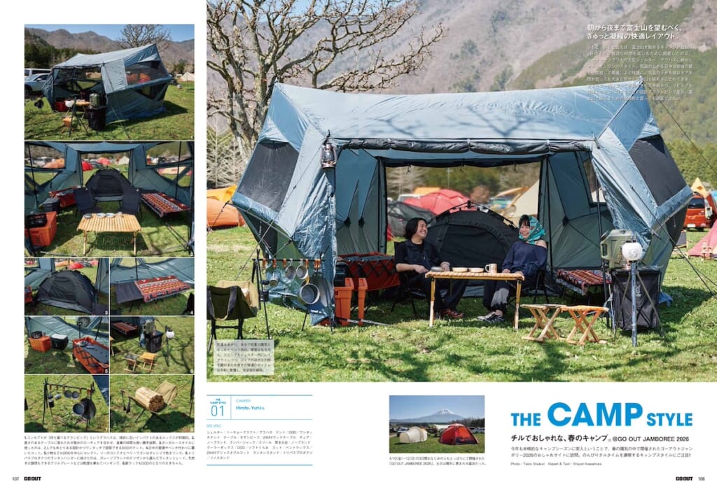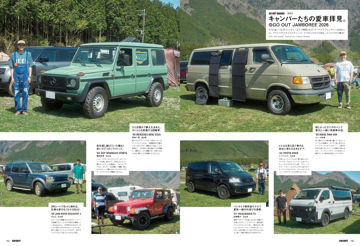 さらに、目的と手段に合わせたトラベルスタイル&パッキング、旅に出たくなるトラベルギアに加え、先日開催されたGO OUT JAMBOREE 2026の会場でスナップした、アウトドアなクルマとおしゃれテントサイトなど、今月も盛りだくさんでお届けします。
