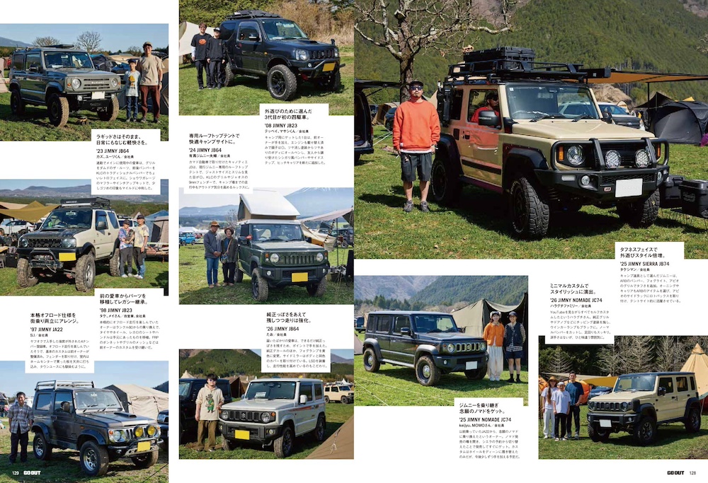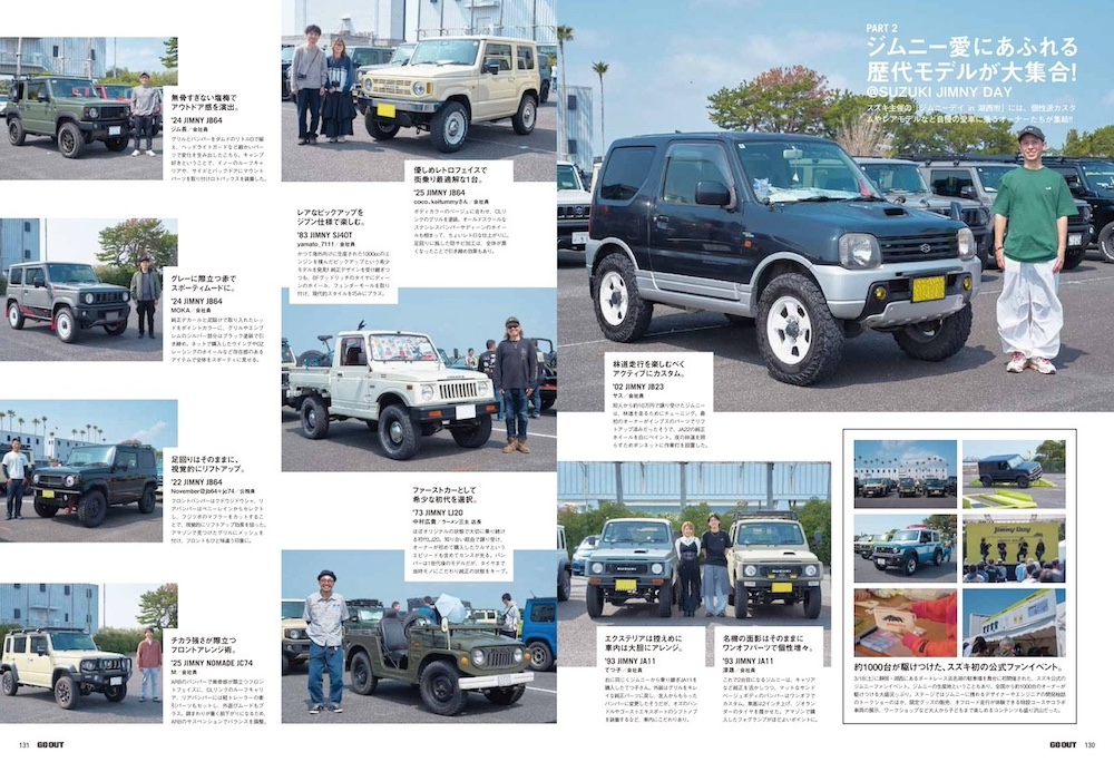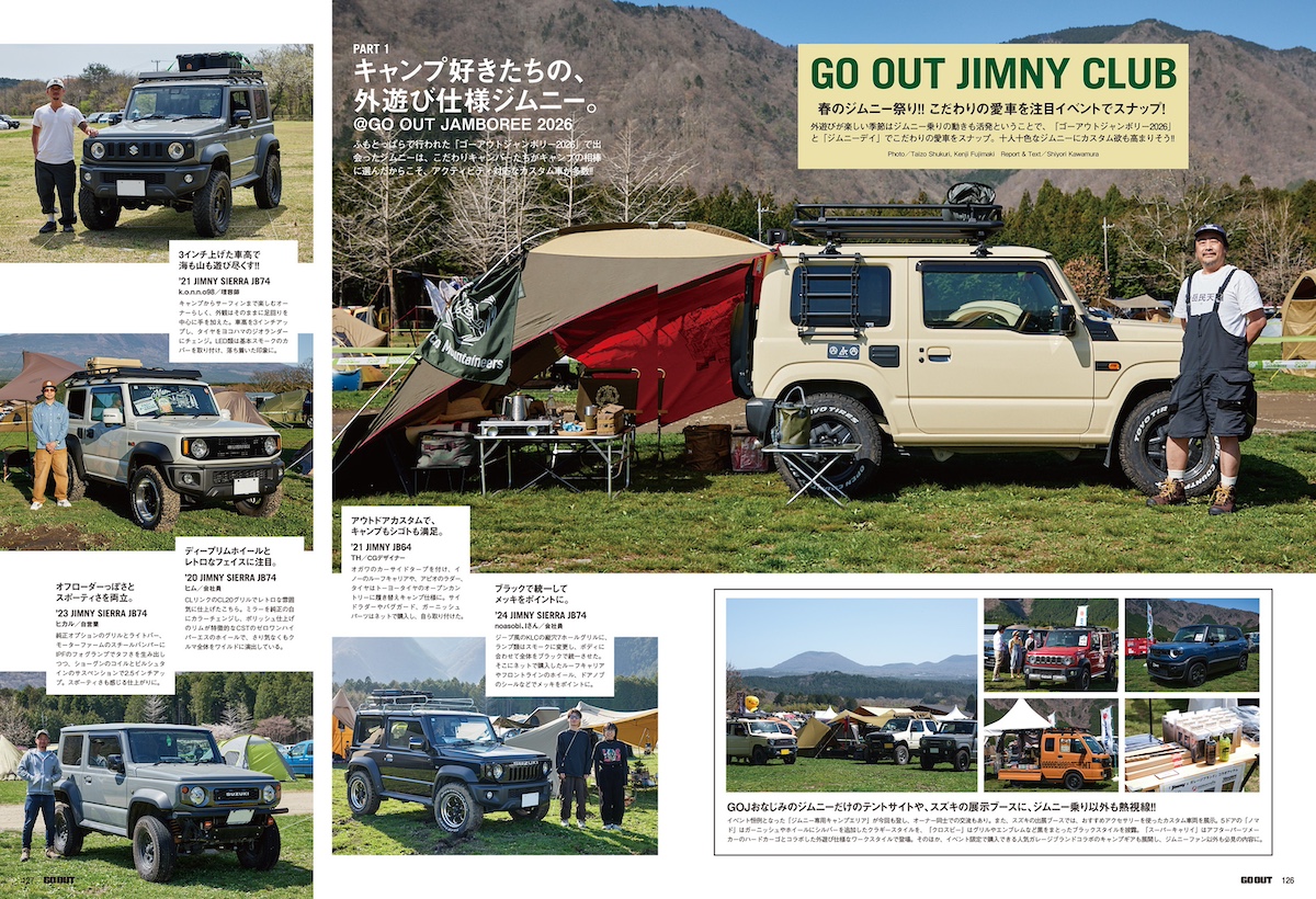 外遊びが楽しい季節はジムニー乗りの動きも活発ということで、「ゴーアウトジャンボリー2026」と「ジムニーデイ」でこだわりの愛車をスナップ。十人十色なジムニーにカスタム欲も高まりそう!!