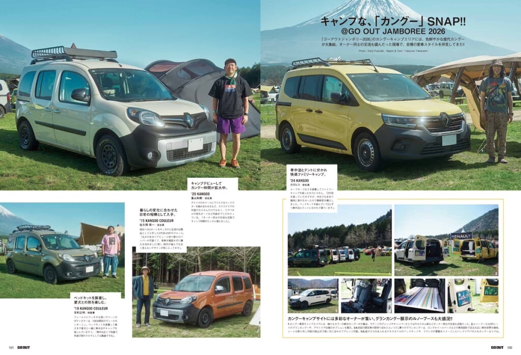 「ゴーアウトジャンボリー2026」のカングーキャンプエリアには、色鮮やかな歴代カングーが大集結。オーナー同士の交流も盛んだった現場で、自慢の愛車スタイルを拝見してきた!!
