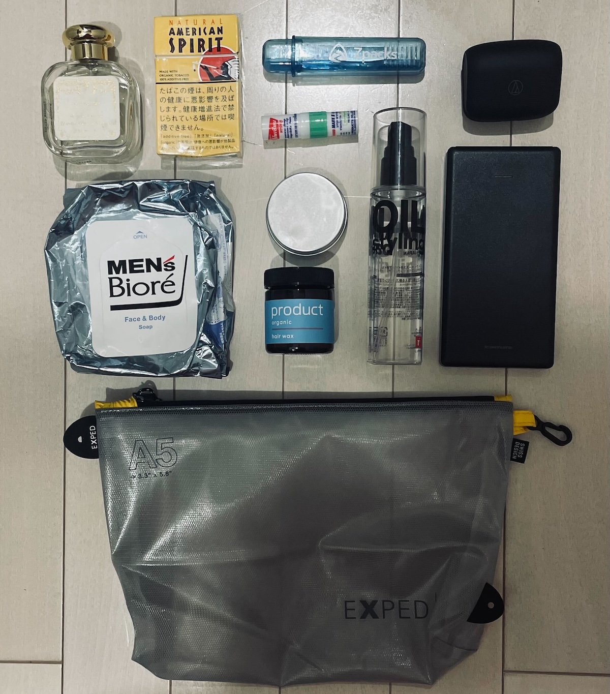 「実際に日常で収納している小物がこちらです。いつも持ち歩いている香水やヘアワックス、洗顔シート、ポータブルバッテリー、イヤホンとかですね。こんなにいろいろ入るんですよ」