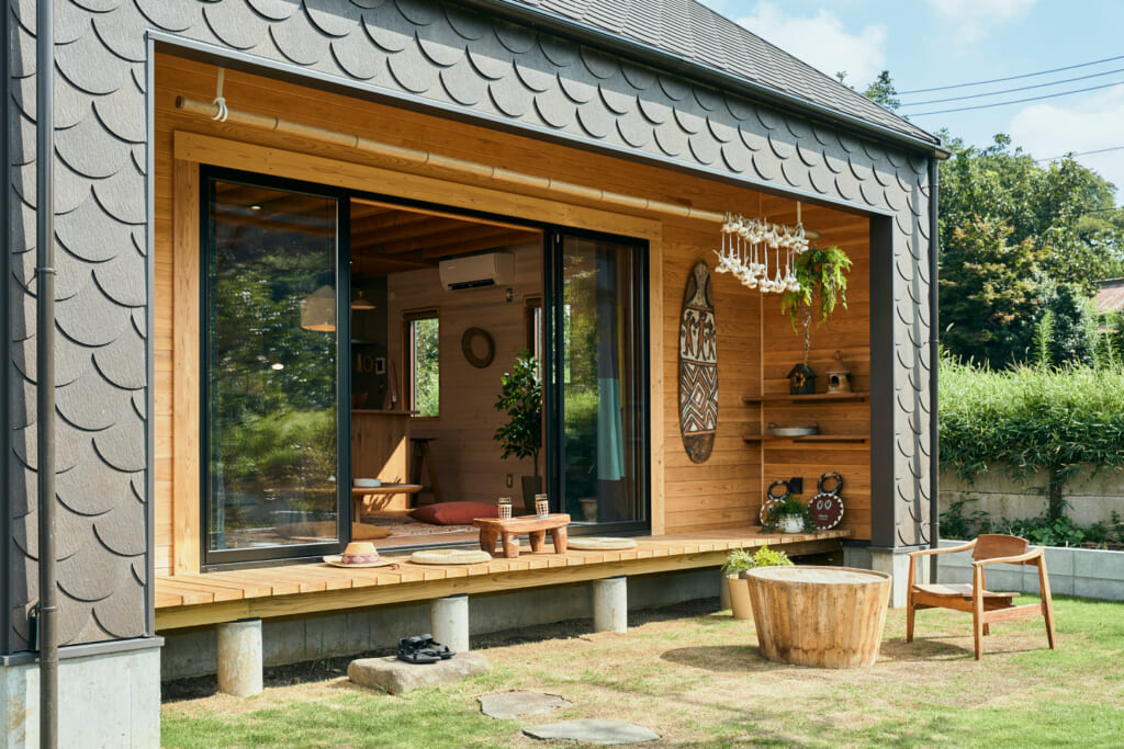 「間貫けのハコ」のコンセプトを象徴する大きな縁側は、室内と外をつなぐ空間。家と庭、家族と近所をつなぐオープンなデザインで、国産杉の内装ともにナチュラルかつ丁寧な暮らしをもたらしてくれる。