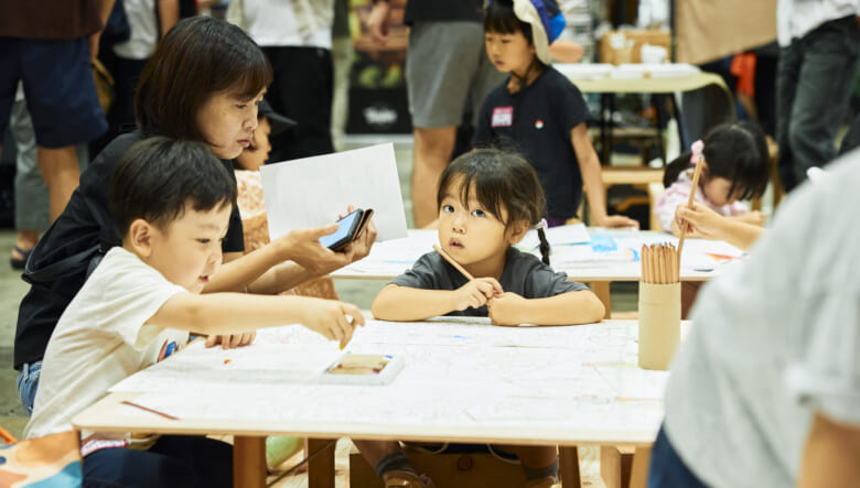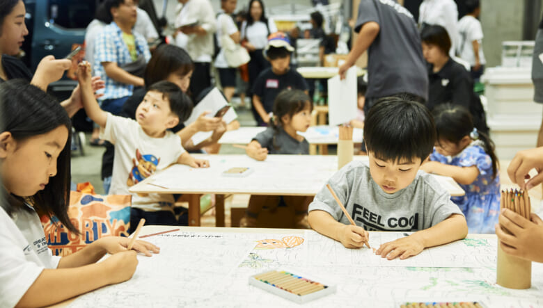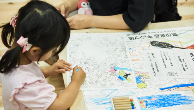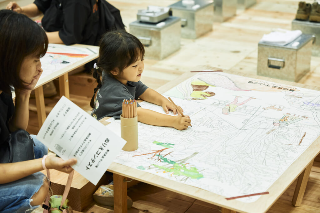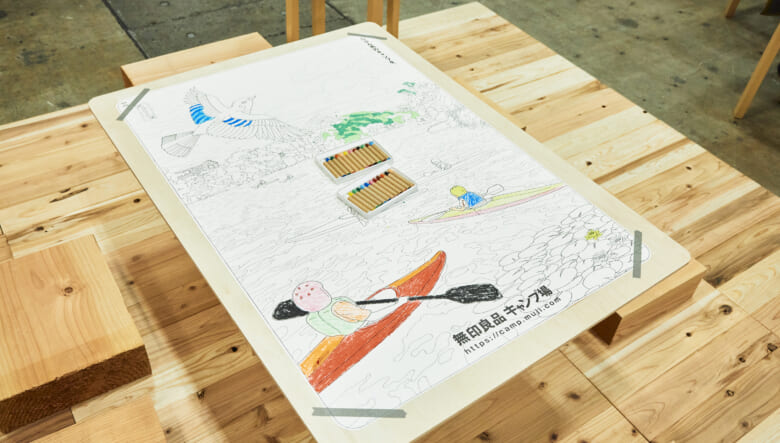 無印良品キャンプ場の自然をテーマにした「ぬりえポスター」に子供達が一所懸命にとりくむ様子が微笑ましい! TOS会場にはキッズコーナーもあるけれど、こちらも負けず劣らずの大盛況。