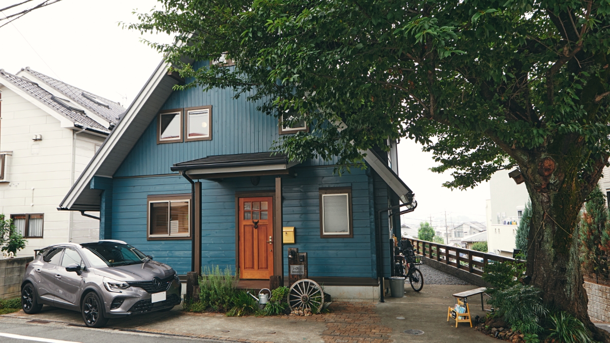 敷地内にある大きな桜の木は、今村家のシンボルツリー。外壁は「G-LOG なつ」純正カラーのレイクブルーをセレクト。夏はブルー×グリーン、桜の季節はブルー×ピンクのコントラストが美しい。愛車はルノーのキャプチャー。