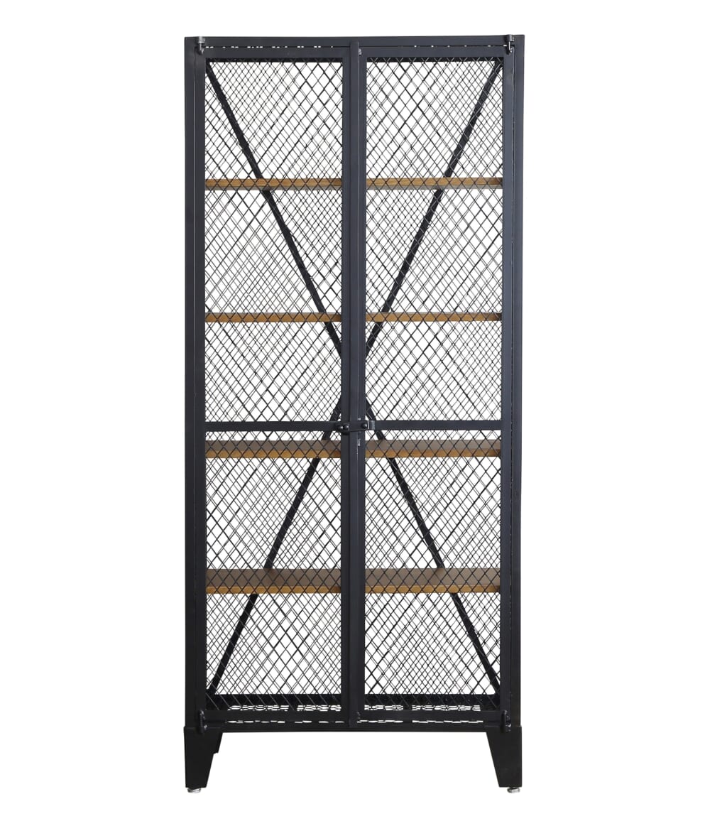 側面と扉にスチールメッシュを、棚板にはMDFを組み合わせブラック仕上げとすることでハードな雰囲気を獲得している。幅80×奥38×高さ178cmサイズで、棚板は16cmピッチで上下位置の調整が可能。