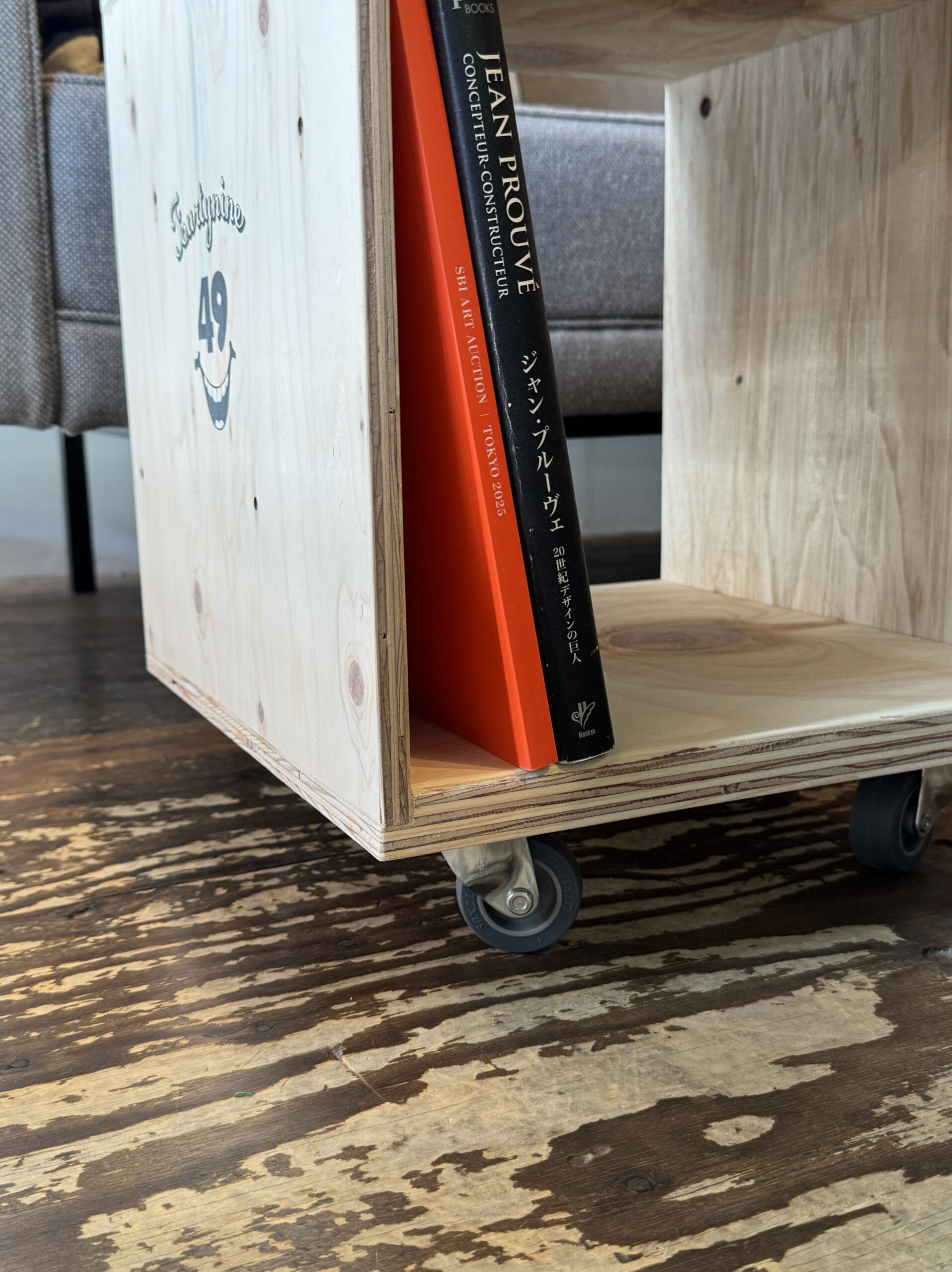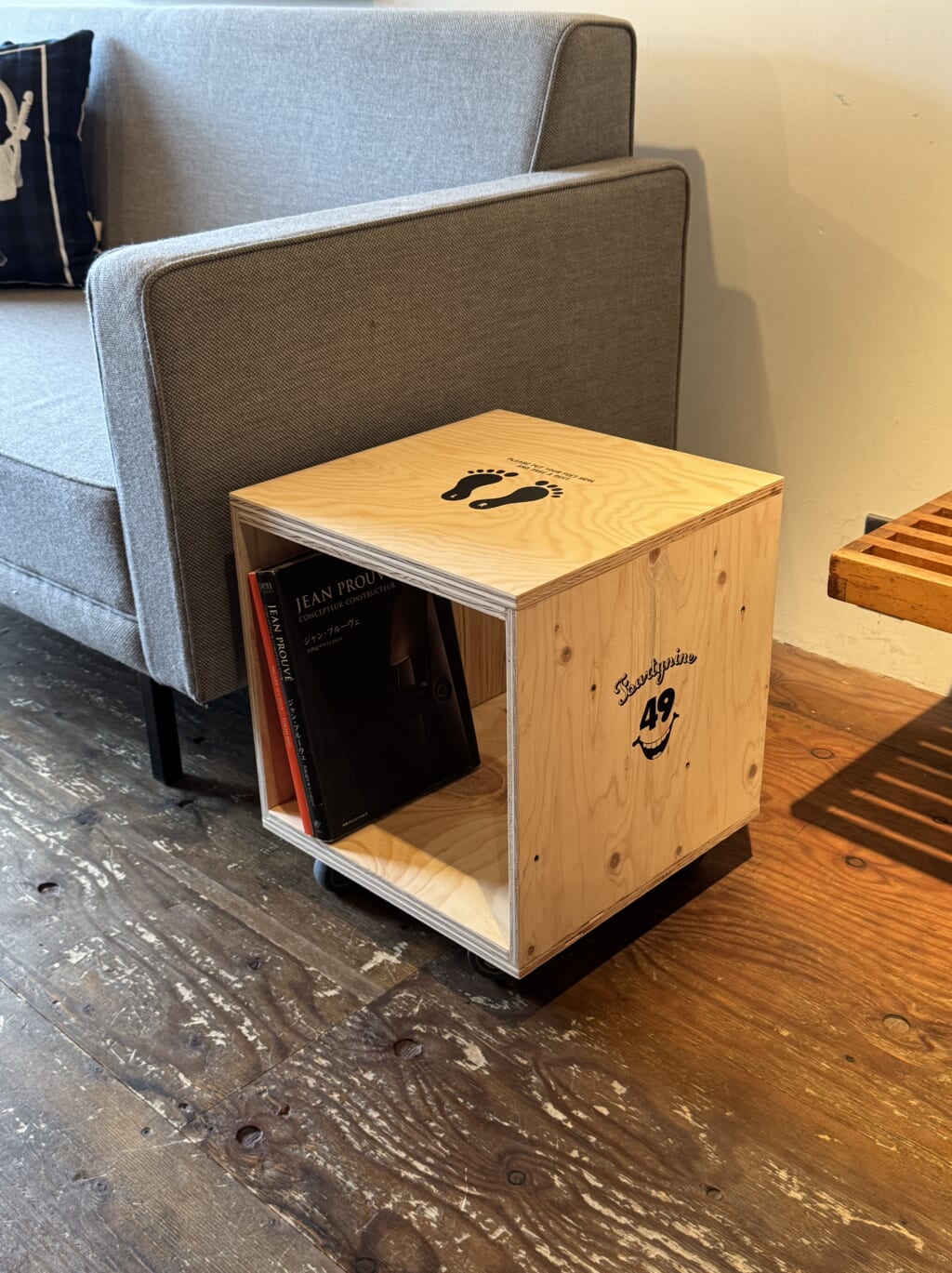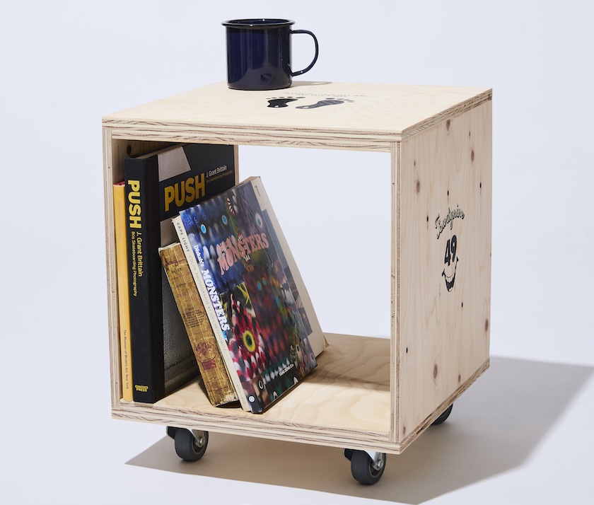 フォーティーナインのロングセラーモデル“Plywood Cube”をベースに、別注だけのデザインでキャスターをセット。置きたい場所にスムーズに移動でき、例え床にホコリが発生してもサッと掃除ができるのも魅力的。