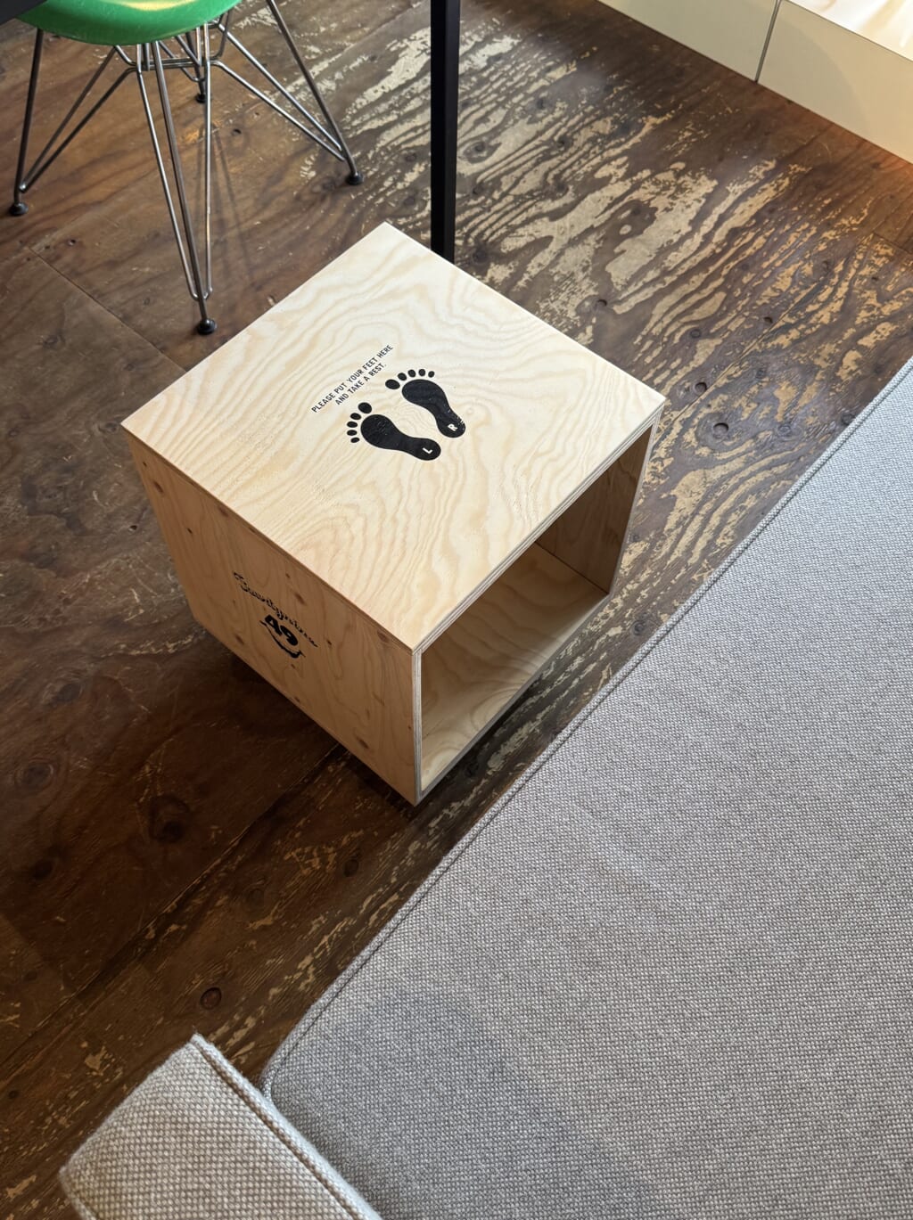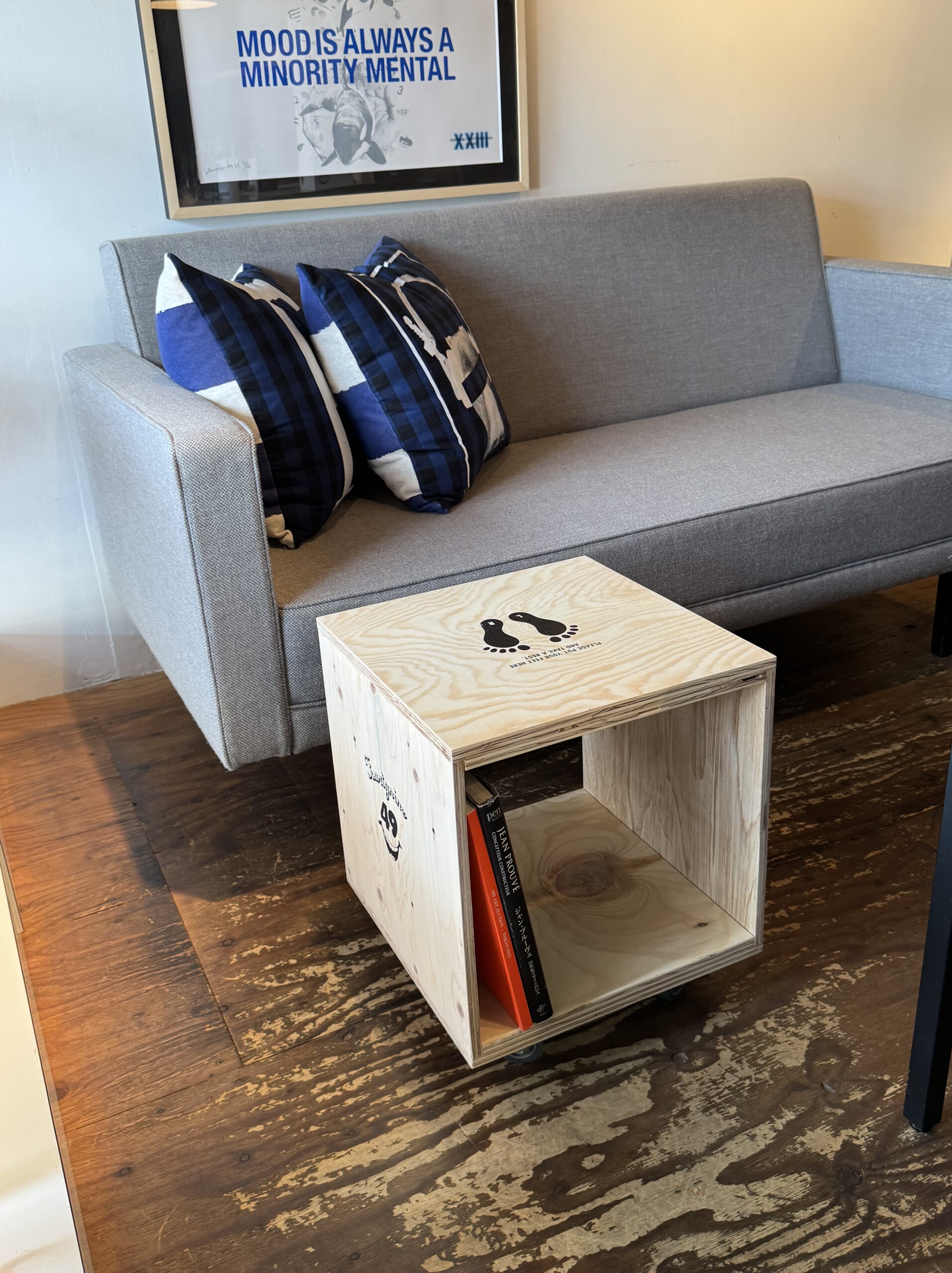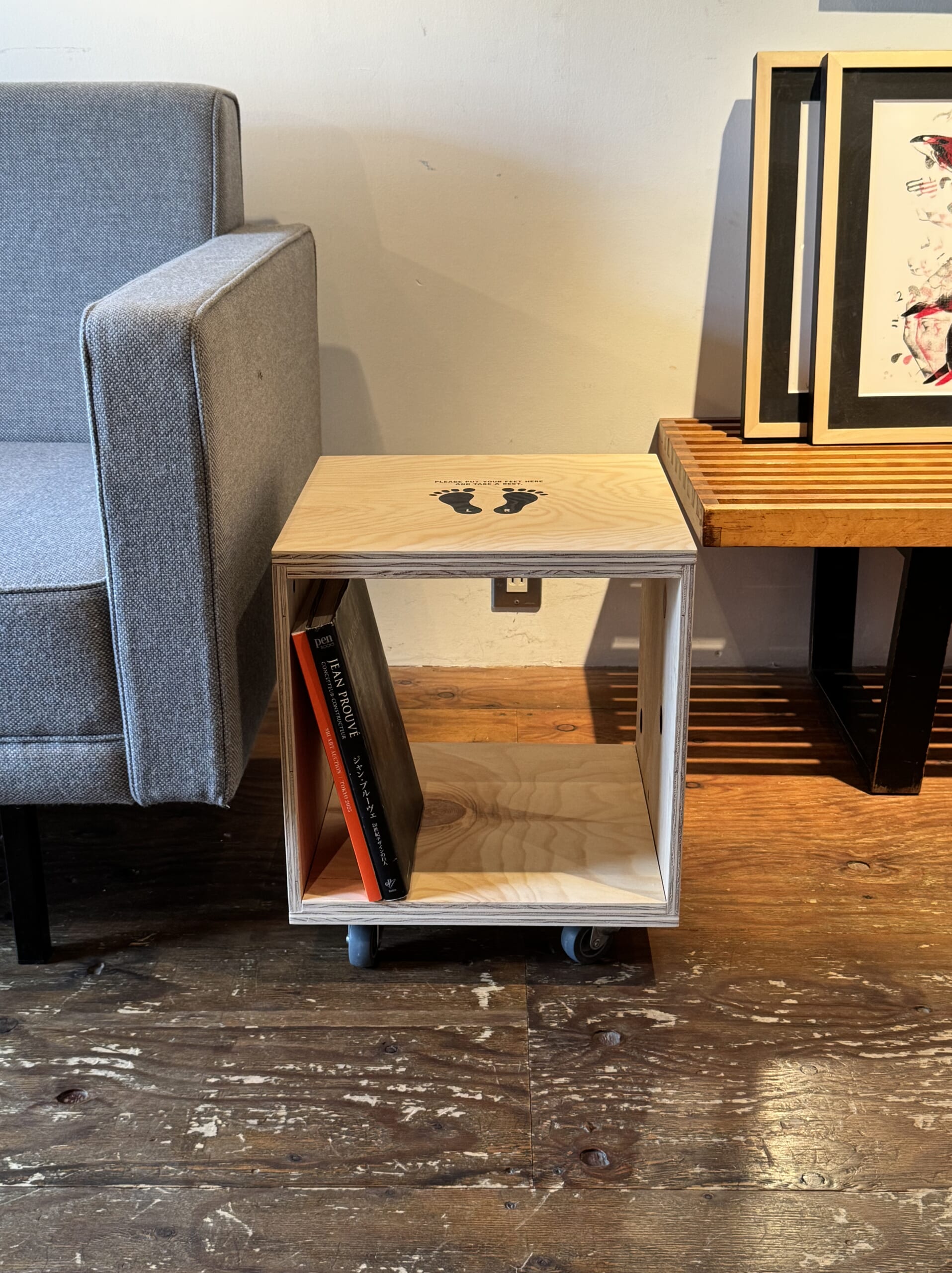高さはキャスターを含めると約41.3cm。前述のように移動性が高いディテールも相まって、ソファの前に置けばオットマンとして活躍。チルタイムのキブンを引き立てるように施した、足のシルエットとユニークなメッセージのプリントも別注だけのデザイン。