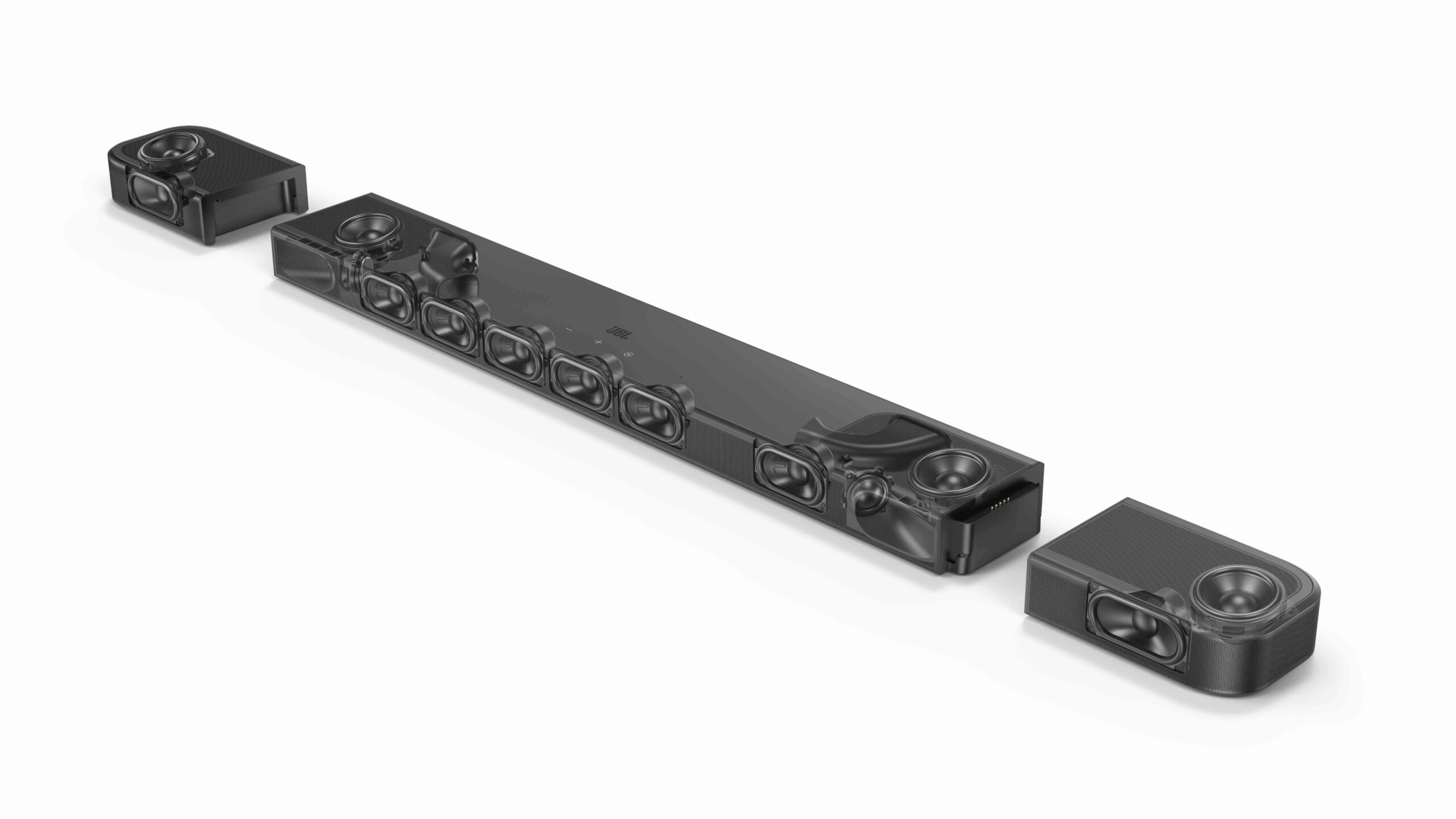 総合出力 960Wを発揮する“JBL BAR 1000MK2”は、全方位からリアルな音に包み込むサウンドを実現する独自技術「MultiBeam™3.0」を採用。スピーカー配置に最適化したアルゴリズムによって、反射する方向や角度を狙えるようになります。