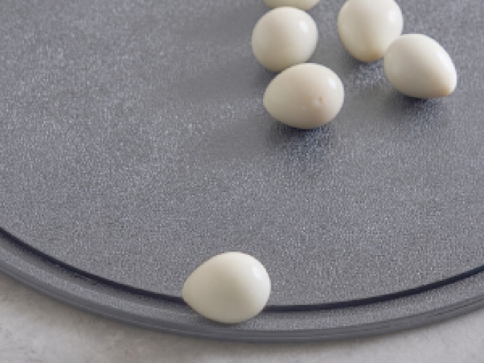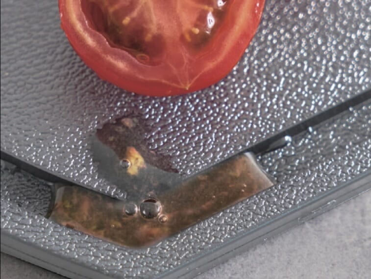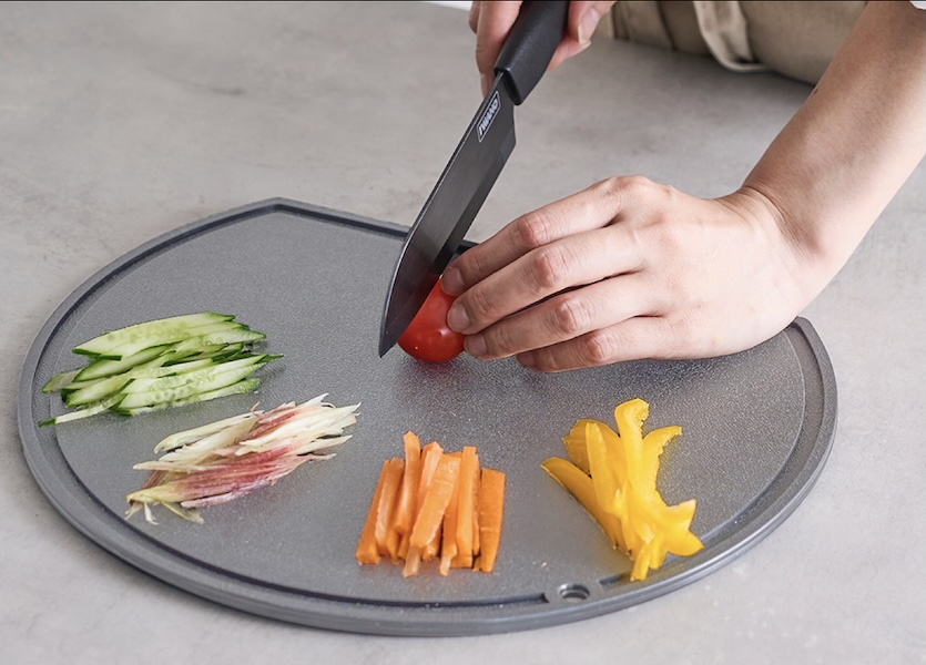 本アイテムの注目すべき点は、まな板のエッジに入れられた独自の“溝”加工。汁気の多い食材や転がりやすい食材も、この“溝”がキャッチしてくれる。また、板の表面には“シボ加工”が施されており、加工中の食材が滑りにくくなるという効果が。これらの工夫によって安心して調理が出来るというわけだ。