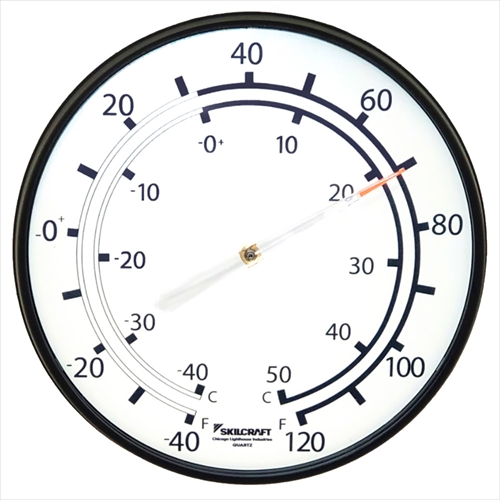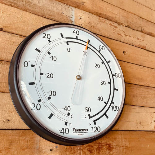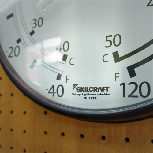 視認性に優れるシンプルな表示と、直径約32cmという大型サイズ。華氏と摂氏をともに知られる温度計は、アメリカの老舗ブランドらしい無骨な雰囲気にデザインされています。