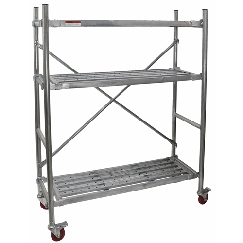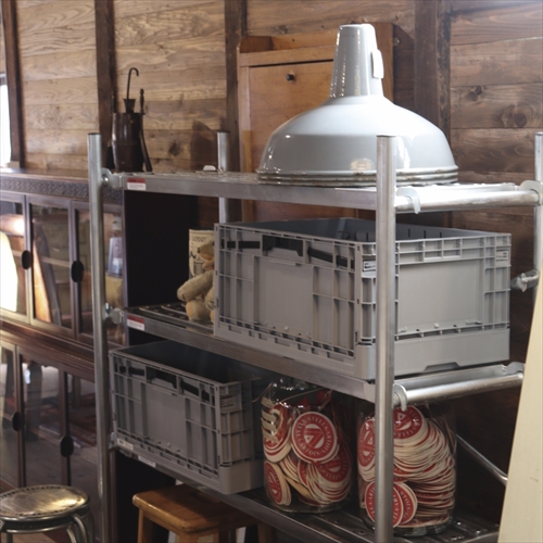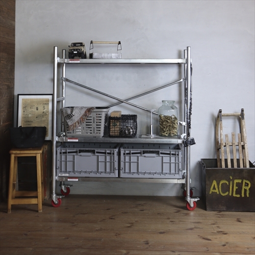 作業現場で使われるインダストアリアルな足場什器を、室内に溶け込むようにリサイズしたシェルフ。3段の棚が設けられ、それぞれ約80kgという優れた耐荷重を発揮。