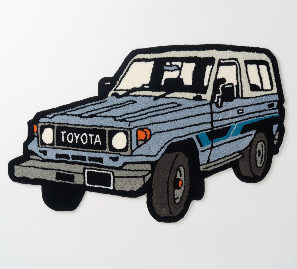これらのラグマットは「タフティングガン」と言う手持ちミシンを使い、職人によって一点ずつほぼ手作業で製作されている。この技法は独特な風合いを生み出し、ソフトで優しい触り心地とヴィンテージ感のあるムードを演出。レトロなランクル70を表現するのにも適している。ムービーで製作過程を紹介しているのでぜひチェックしてみよう。