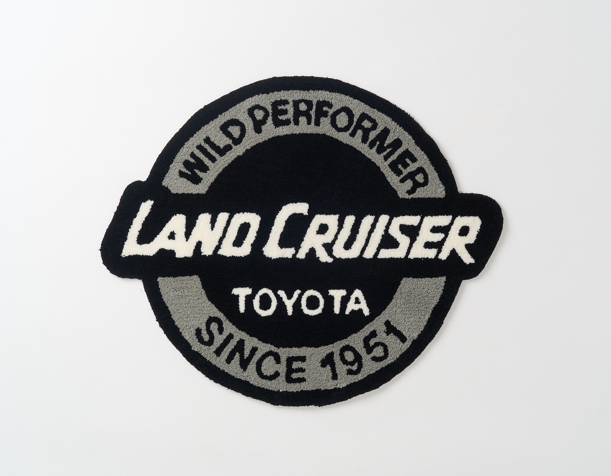 もう一つは、ランドクルーザーのロゴをエンブレム風にあしらったサークル型。直径735cm(円部分)はラグとして使いやすいサイズなうえ、モノトーンの配色でインテリアに馴染むデザインだ。