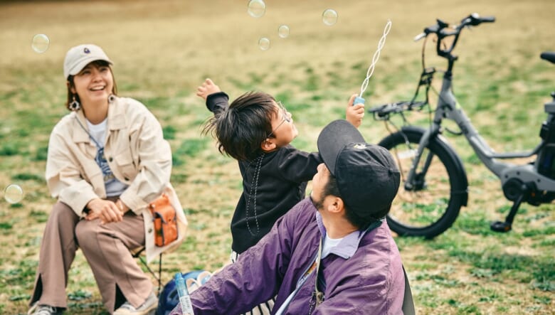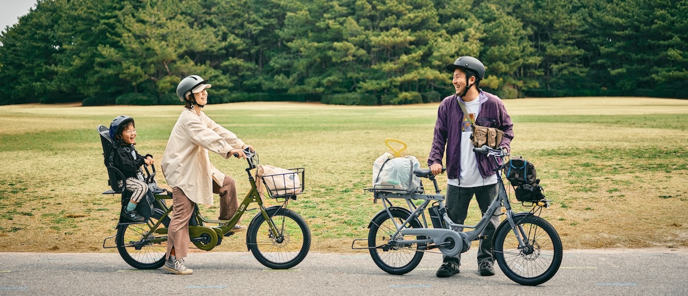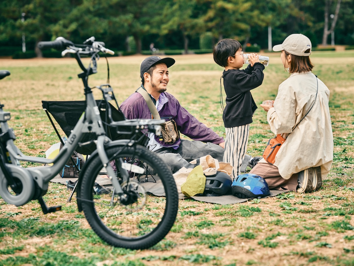 ギア感覚で扱えるスタイリッシュな電動ミニベロ「ログワゴンe」は、外遊び好きの村田さんファミリーも大満足の様子。